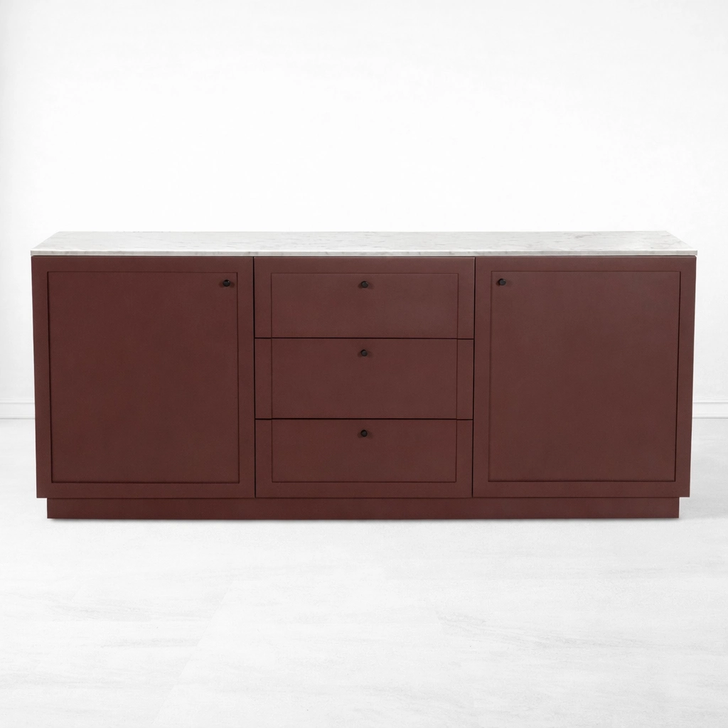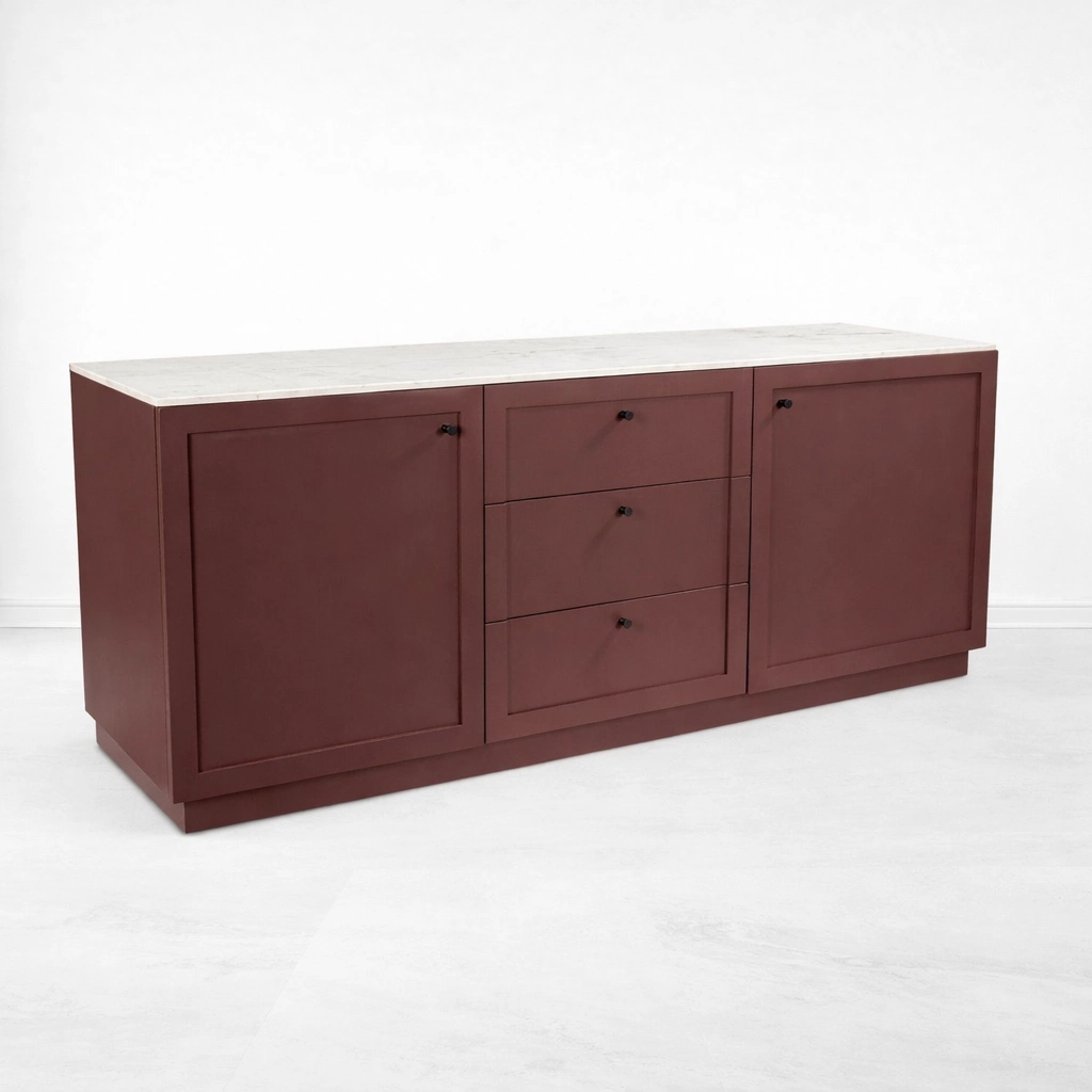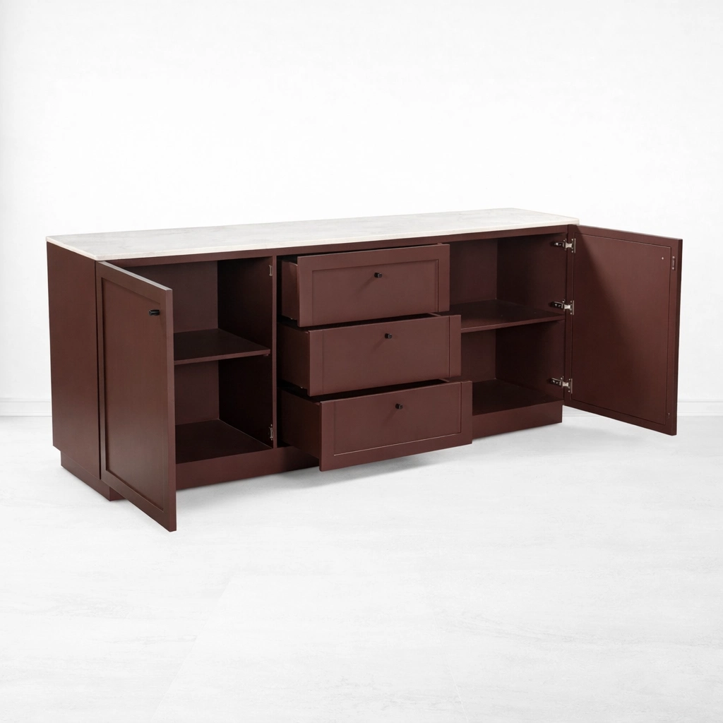 The painted body gives the Carmine Marble Top Teak Wood Sideboard a distinctive identity. The tone feels warm, deep, and grounded, offering a more curated look than a standard natural wood finish. The light marble top creates visual balance and introduces a refined surface contrast that works beautifully in dining rooms, living rooms, hallways, office lounges, and hospitality-inspired interiors. Together, the material contrast and clean proportions make this sideboard versatile enough for both contemporary and transitional spaces.