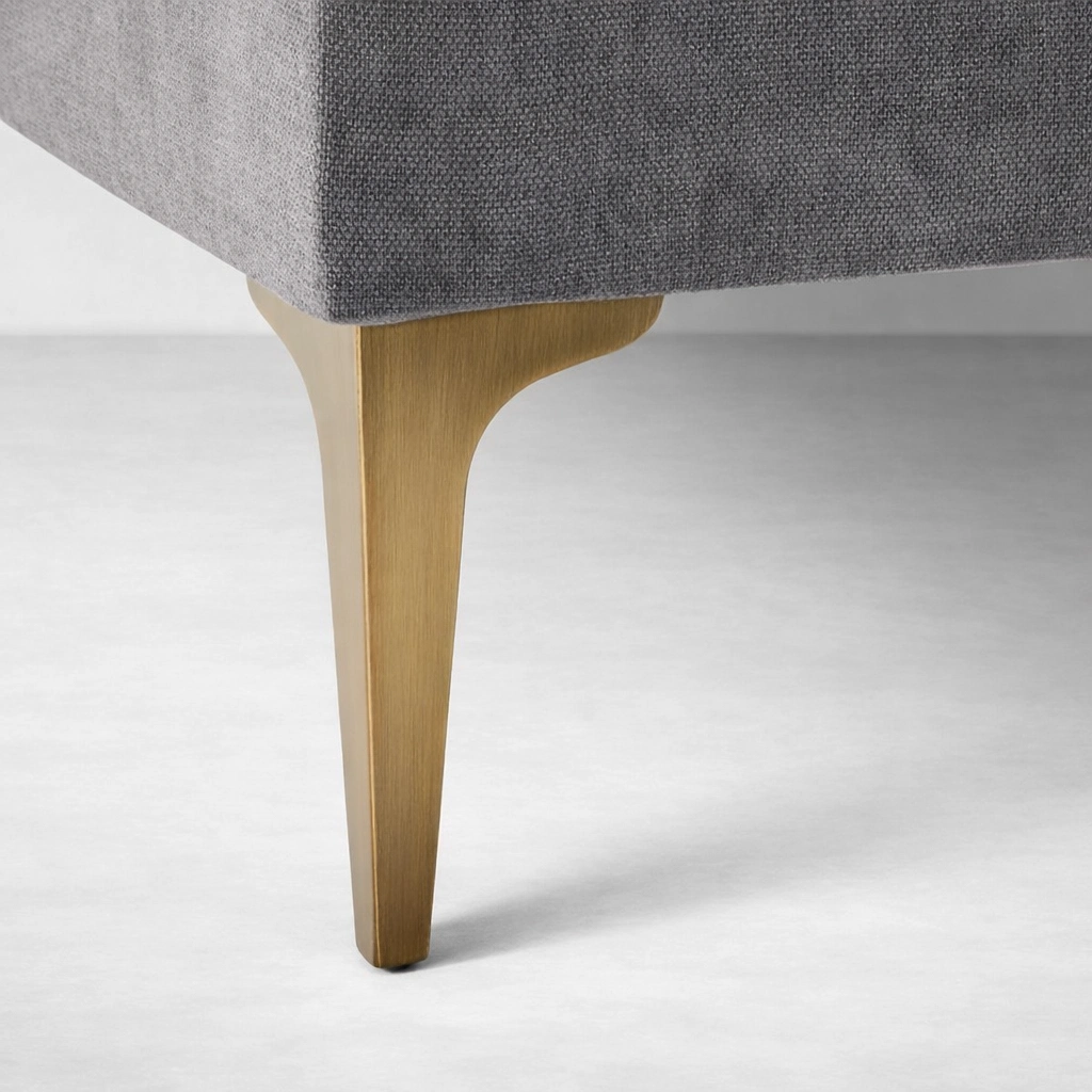 • Brass-finish sofa leg detail on charcoal grey sectional by INTERIORZE