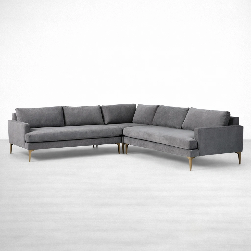 We made this L shape sectional for homes that prefer a modern look with a comfortable, relaxed sit. The charcoal grey upholstery keeps the style neutral and easy to match with most color palettes. The brass-finish legs add a subtle touch of warmth without looking loud, and the overall profile stays clean and refined charcoal grey L shape sectional sofa.