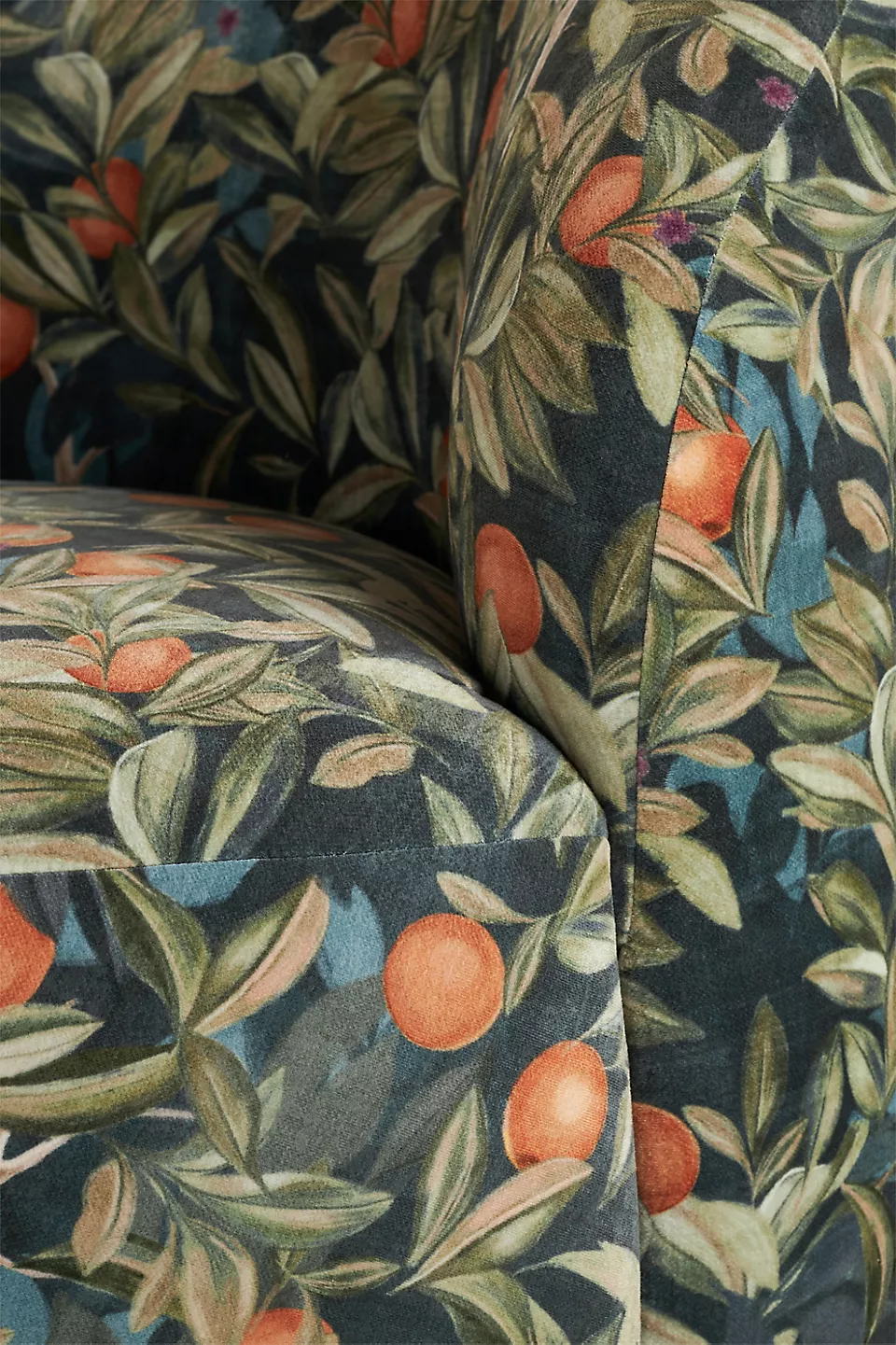 • Upholstery: premium botanical print fabric with citrus and leaf motif
