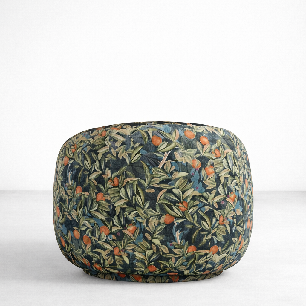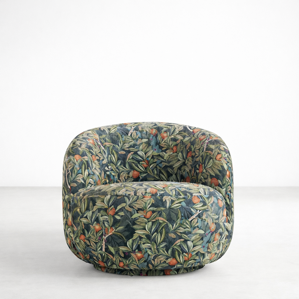 Citrus grove botanical round lounge chair by INTERIORZE is designed as a soft, sculptural accent that instantly brightens any space. The rounded back and low, wide seat are fully upholstered in a rich botanical fabric featuring painterly oranges, branches and layered green leaves, creating a vivid garden-inspired focal point.