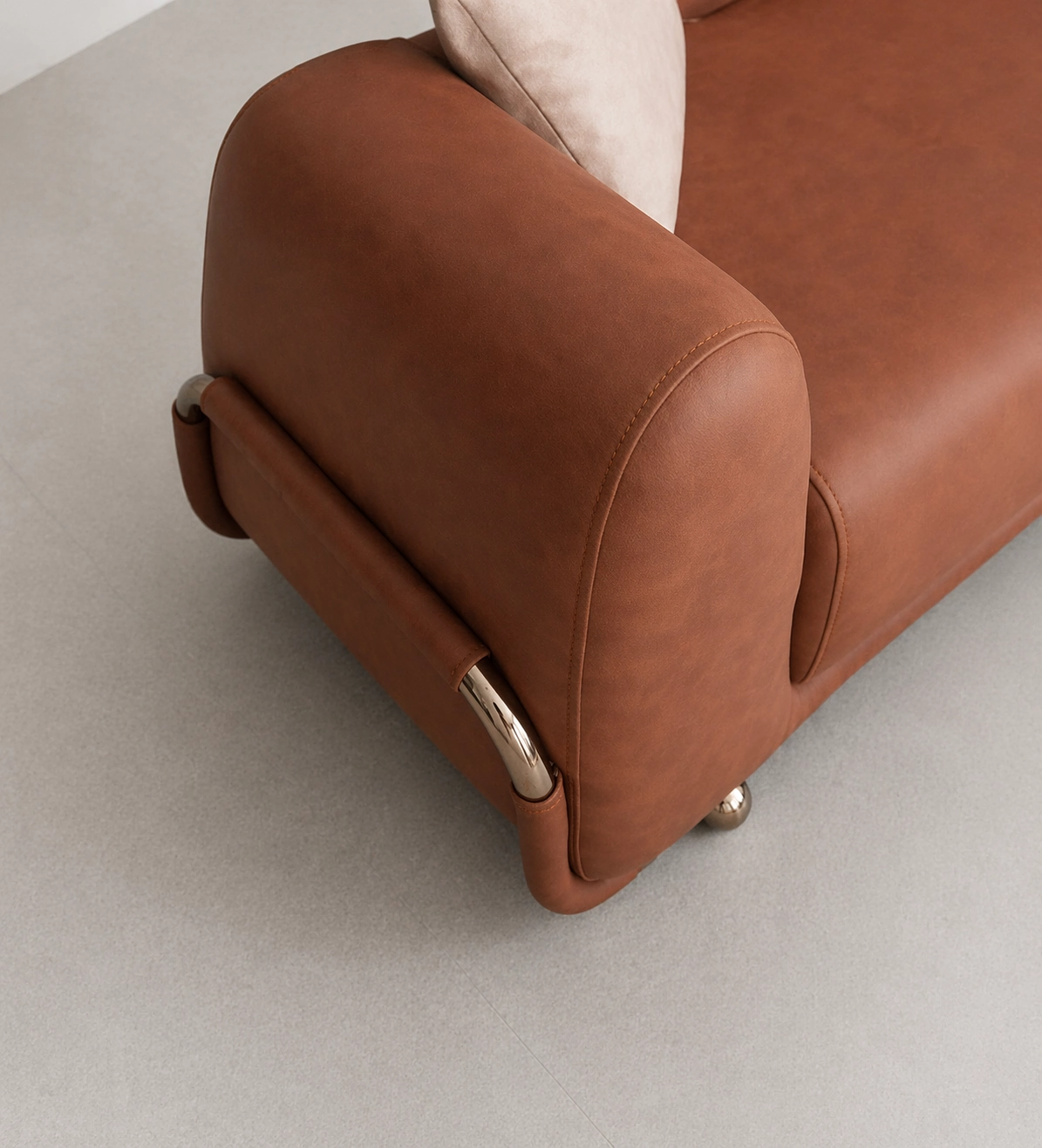 The INTERIORZE ORVANO cognac leatherette sofa features smooth premium upholstery, clean panel stitching, rounded arms, and sleek metallic accent legs. Made to order with customization in size, upholstery, stitching, and finish, it is ideal for modern living rooms and lounge spaces.