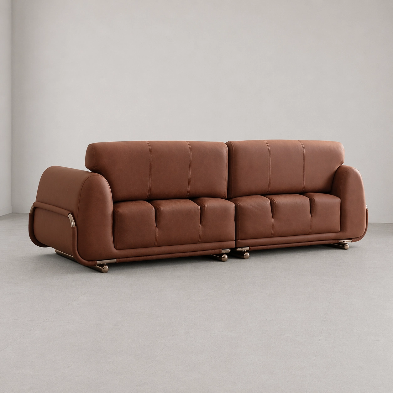 This design has a smooth leatherette-style upholstery that gives the appearance of leather with an easy-care finish. The deep seat cushions are divided with neat vertical stitching, giving the sofa a tailored and modern look. The backrest has a soft angled profile for relaxed support, while the rounded armrests create a comfortable side resting area. The small metallic rolling-style legs and chrome side accents give the design a sleek premium touch, making this sofa stand out without looking overly heavy cognac leatherette sofa.