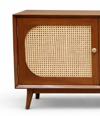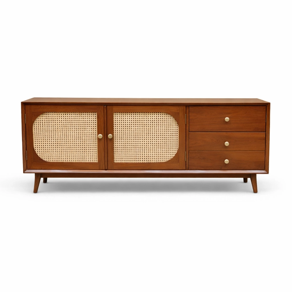 Its teak wood construction highlights the natural grain, warm tonal richness, and lasting character of the material, giving the piece a welcoming and composed look. The woven cane door panels soften the overall form and add handcrafted texture, while the side drawer section creates a balanced visual rhythm across the front. The design feels minimal and functional, yet the cane detailing and warm polish give it a distinctive and timeless identity.