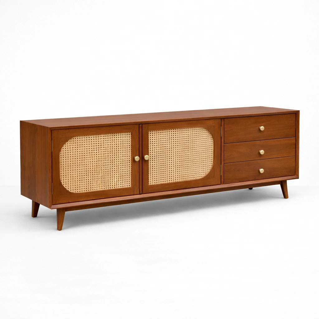 The form of the Cove Cane Teak Wood Media Console is simple, but its proportions give it a quiet and memorable identity. The woven cane doors bring warmth and texture, while the side drawer arrangement adds everyday function without disturbing the clean look of the piece. This makes the unit suitable as a TV unit, media cabinet, entertainment console, or long storage console for interiors that value both utility and understated design.