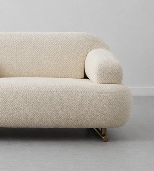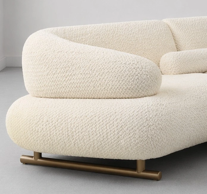 This design stands out through its beautifully rounded silhouette and cocoon-like comfort. The softly sculpted arms, generously padded seating, and smooth integrated backrest create a relaxed lounging experience without losing its designer appeal. The boucle surface adds tactile richness, while the muted metallic support base keeps the sofa grounded and visually sophisticated. It pairs naturally with beige palettes, brushed metal accents, walnut tones, stone flooring, and soft layered decor themes cream boucle sofa.