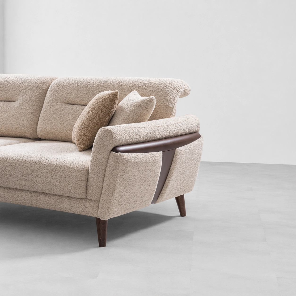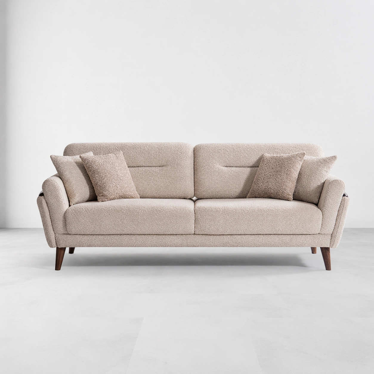 The INTERIORZE ELORA cream boucle sofa is a premium modern sofa designed with soft textured upholstery, slim tapered wooden legs, curved cushioned arms, wide seating, and a clean designer body. Its warm cream shade and minimal wooden detailing make it perfect for living rooms, lounges, apartments, villas, studios, offices, and hotel seating areas cream boucle sofa.