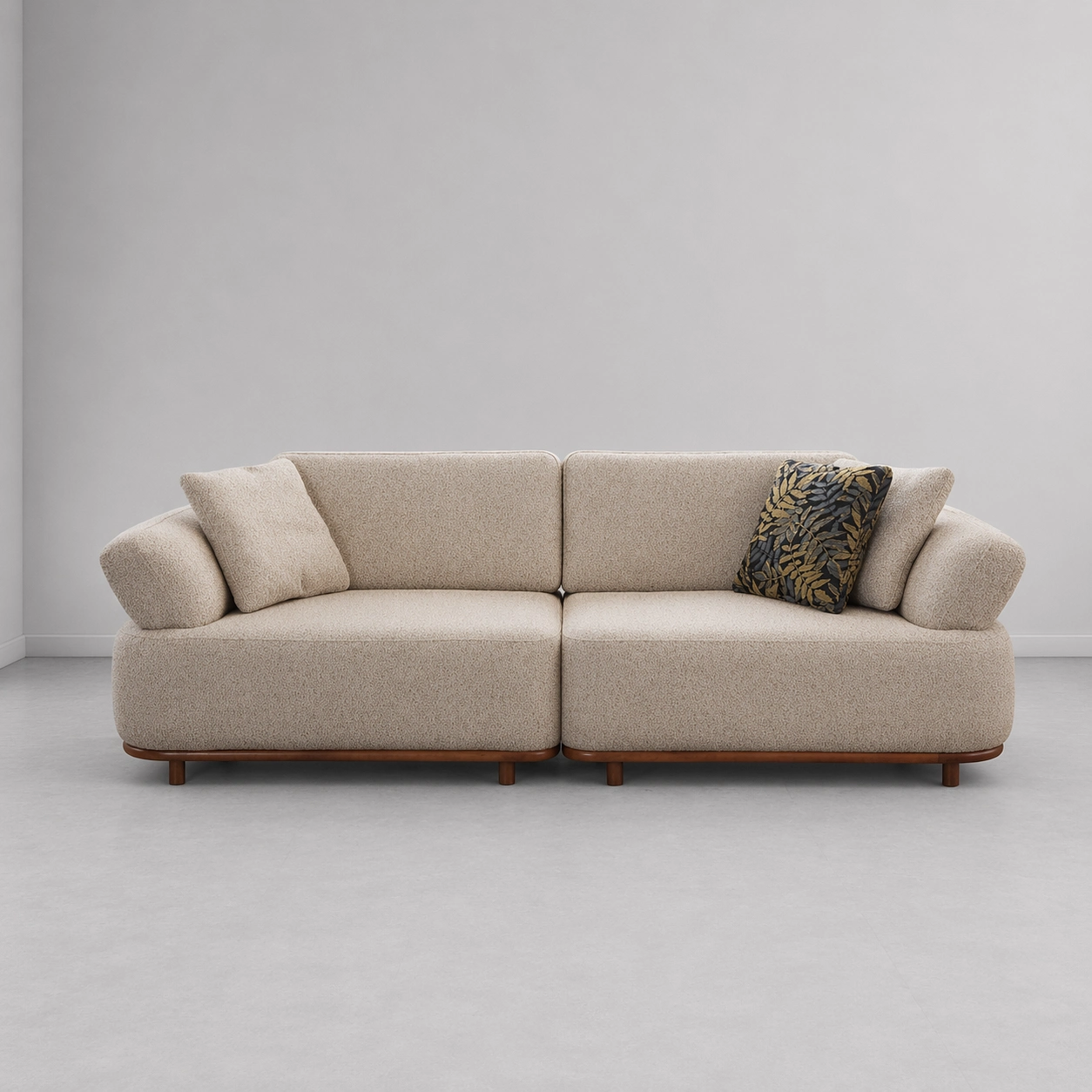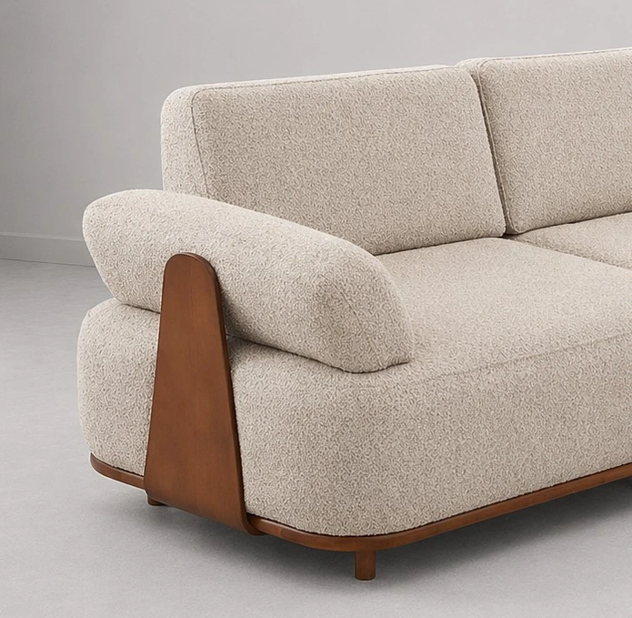 The INTERIORZE LUMORA cream boucle sofa is a premium modern sofa designed with soft textured upholstery, rounded cushioned arms, wide comfortable seating, wooden side panels, and a clean low-profile body. Its elegant cream shade and warm wooden detailing make it perfect for living rooms, lounges, apartments, villas, studios, offices, and hotel seating spaces cream boucle sofa.