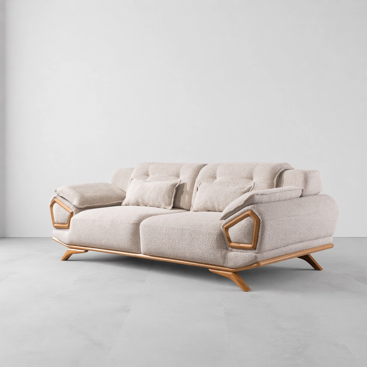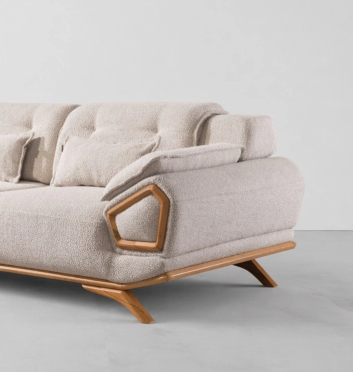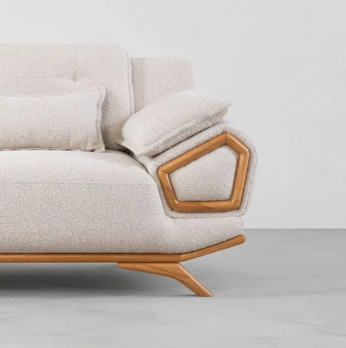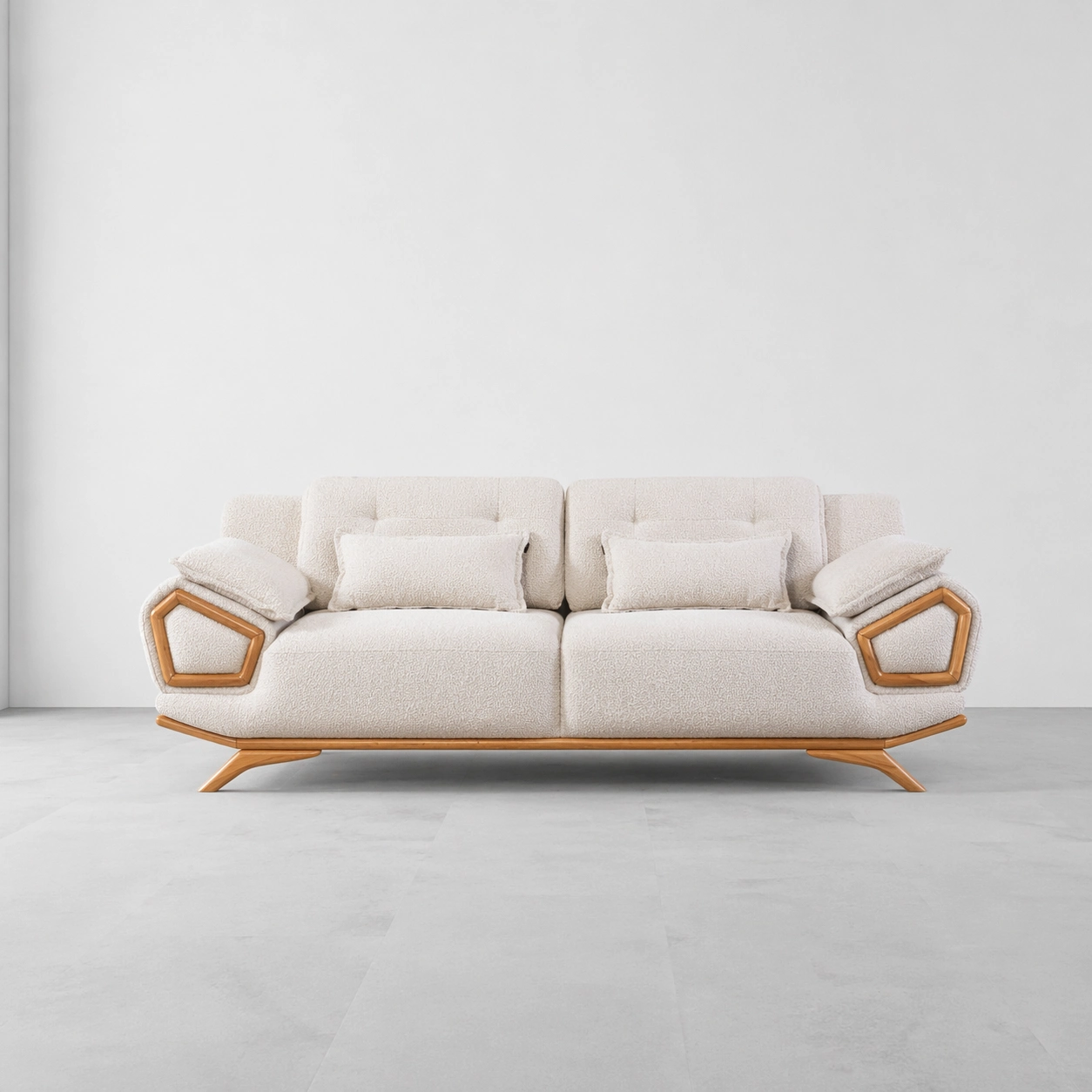 This sofa features broad seats, padded backrests, adjustable-style side pillows, slim lumbar cushions, wooden side accents, and a low-profile base for a clean contemporary appearance. The wooden pentagon detail on both arms makes the design stand out beautifully in luxury living rooms and lounge spaces cream boucle sofa.