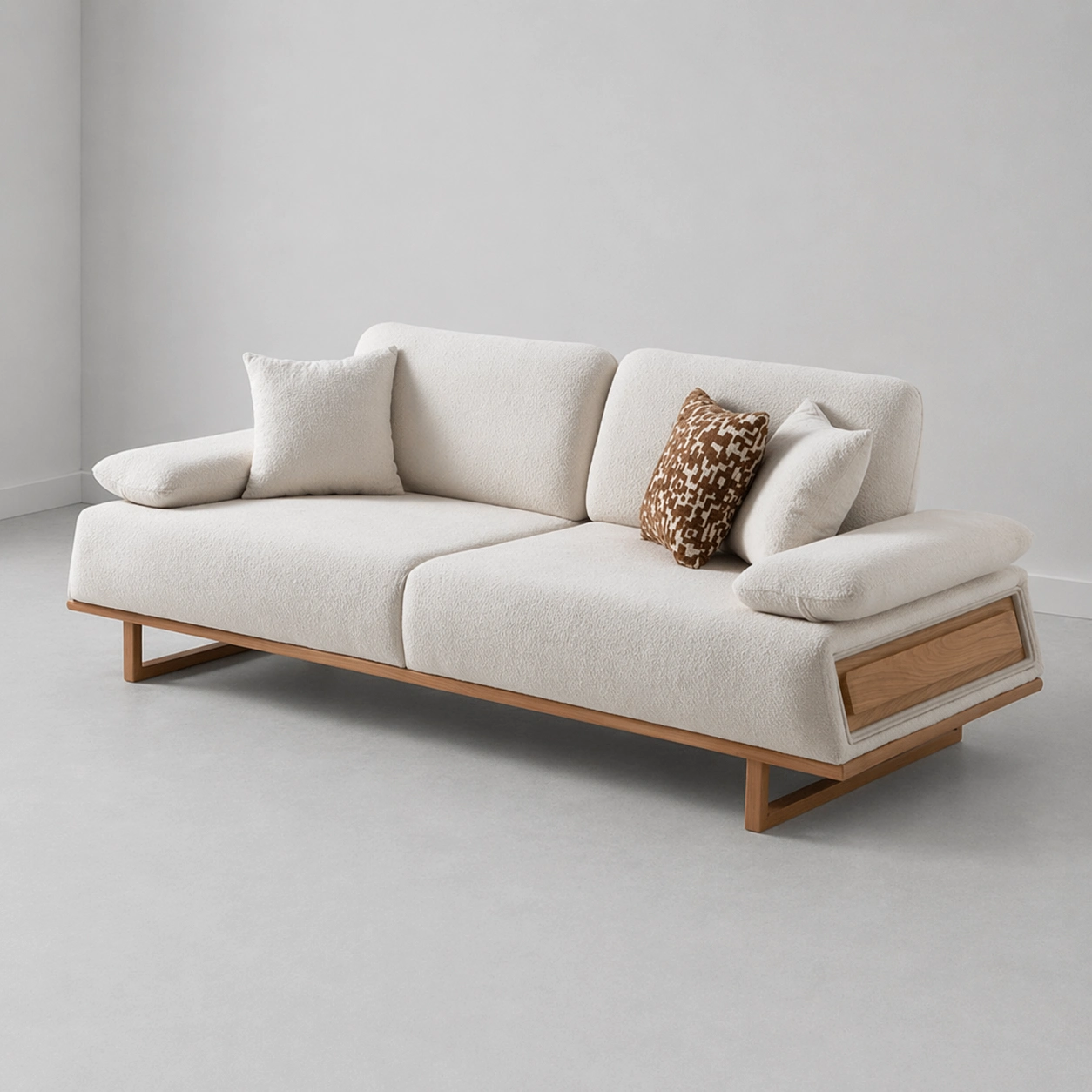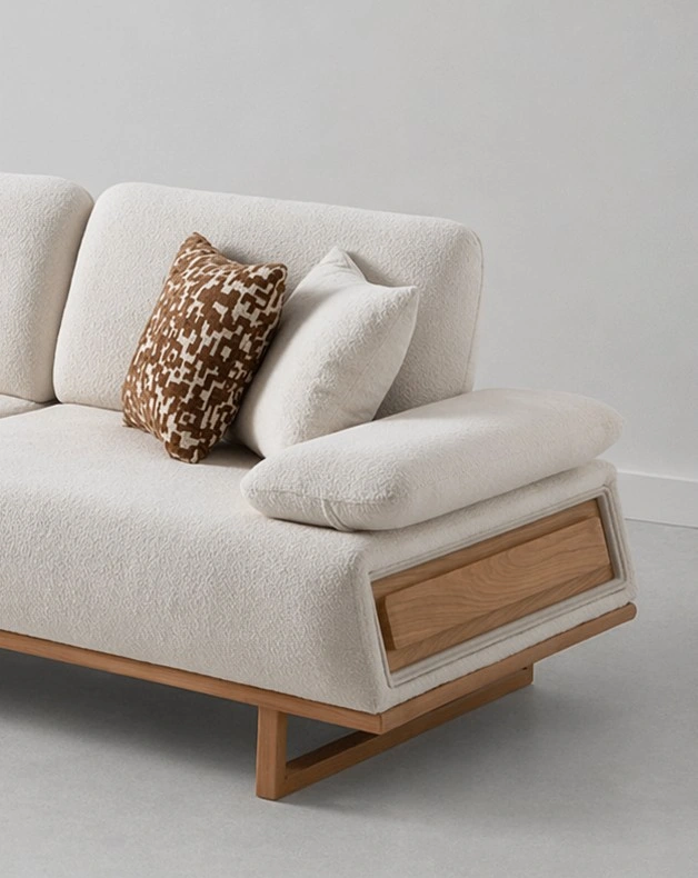This sofa comes with a spacious 3-seater design, broad seat cushions, comfortable back cushions, soft side pillows, and a stylish wooden panel detail on the armrest. The cream boucle-style fabric gives the sofa a soft premium look, while the wooden frame detail adds natural warmth and elegance cream boucle sofa.