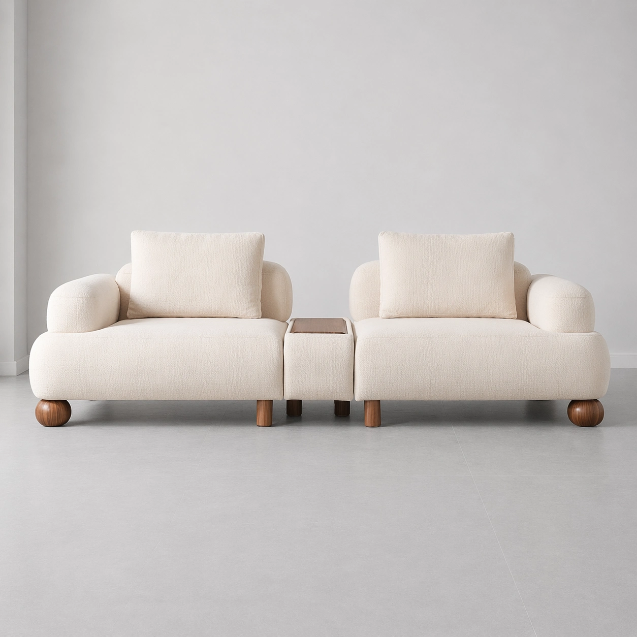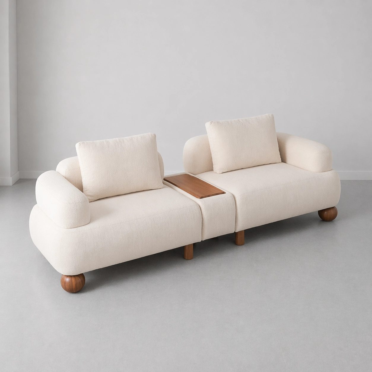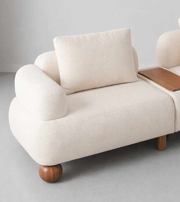 This design stands out for its balanced mix of comfort and utility. The deep cushioned seats offer a calm lounging experience, while the softly curved arm supports and supportive back cushions maintain a clean, structured look. The center tray detail adds everyday function for keeping books, decor, or serving essentials close at hand. Its soft cream tone pairs beautifully with beige palettes, warm oak or walnut wood finishes, stone flooring, and layered neutral interiors cream modular sofa.