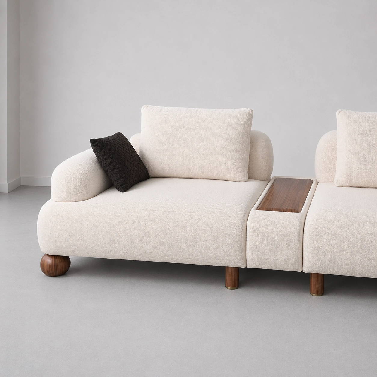 The INTERIORZE MIREVA cream modular sofa is designed for interiors that value softness, flexibility, and clean contemporary styling. Its rounded silhouette, plush cream upholstery, and low relaxed profile create a warm and inviting presence, while the modular composition adds practical elegance to modern spaces. The integrated wooden center tray and rounded wood feet bring in a subtle natural contrast, making this sofa ideal for premium living rooms, lounge corners, studio apartments, and thoughtfully designed family spaces cream modular sofa.