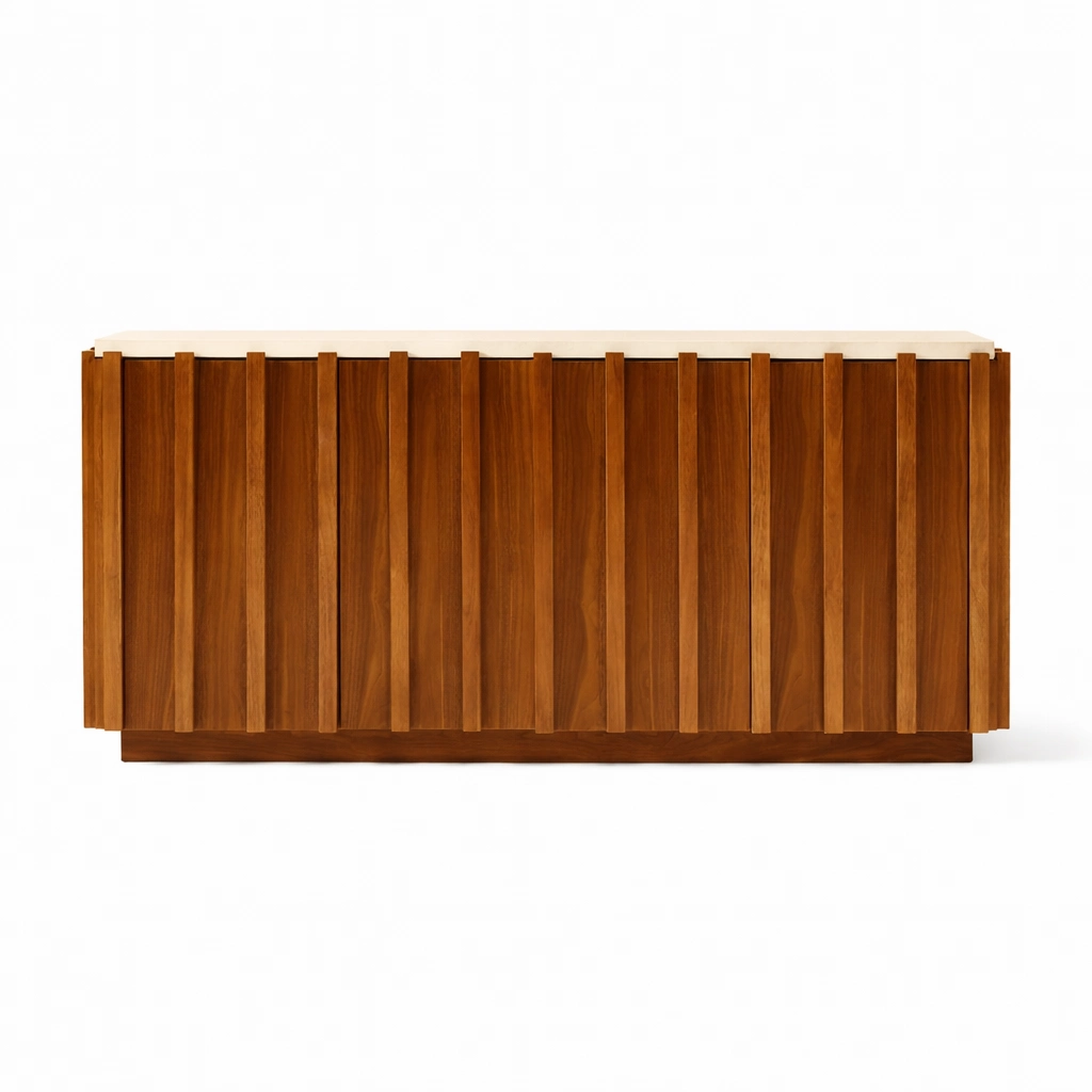 Its teak wood construction highlights the natural grain, warm tonal variation, and lasting character of the material, giving the piece a rich and welcoming look. The front is designed with a repeated vertical panel pattern that adds rhythm, depth, and a strong visual identity without making the unit feel heavy. The top surface appears in a light contrasting tone, which adds balance to the overall look and gives the console a more elevated and premium feel. Please replace the top material line below with your exact production material before publishing if needed.