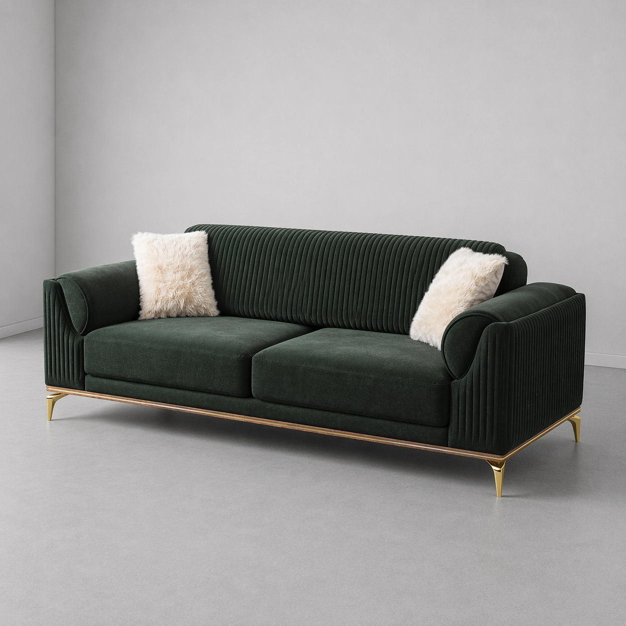 The INTERIORZE LUXE dark green velvet sofa is a premium designer sofa made for modern luxury interiors. It features deep dark green velvet-look upholstery, vertical ribbed detailing on the backrest and side arms, wide cushioned seating, rounded inner arm cushions, slim gold metal legs, and soft white accent pillows dark green velvet sofa.
