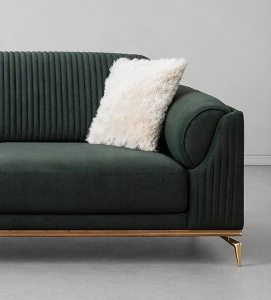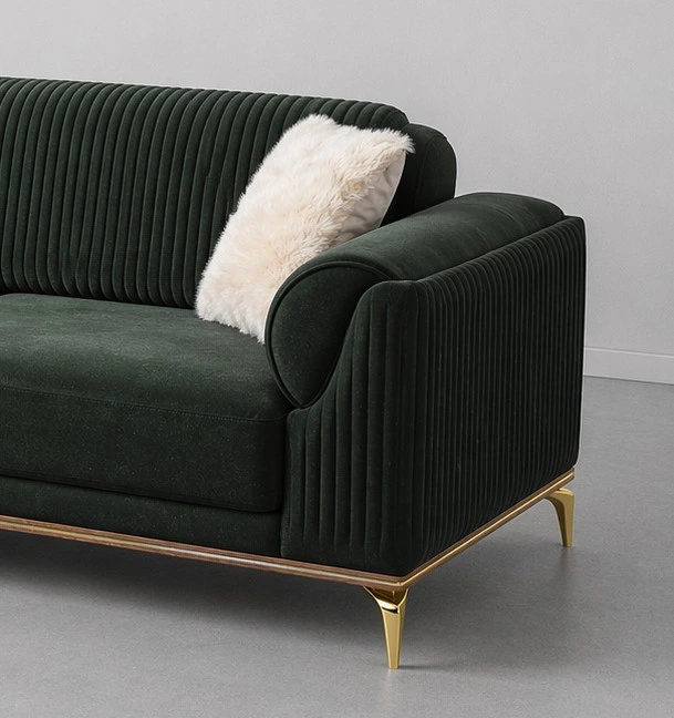This sofa has a clean straight-line silhouette with a rich luxury finish. The ribbed back design gives it a premium designer look, while the dark green color adds depth and elegance to the living room. Its gold legs and bottom metal trim create a stylish contrast, making it perfect for luxury homes, lounges, offices, hotels, and premium seating areas dark green velvet sofa.