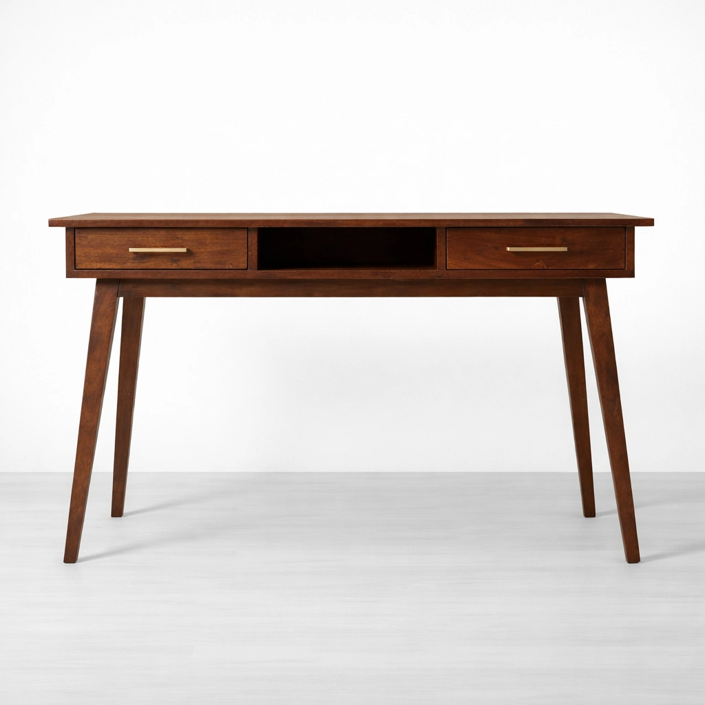 Its design feels simple and composed, while the open middle section adds everyday convenience for books, notebooks, papers, or a keyboard tray setup. The drawers on both sides help keep small work essentials organized, and the brass-tone handles add a subtle contrast that complements the rich wood finish without overpowering the design.