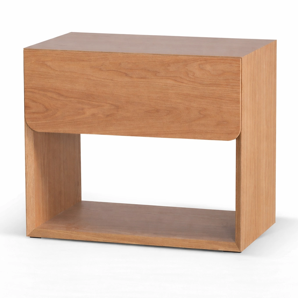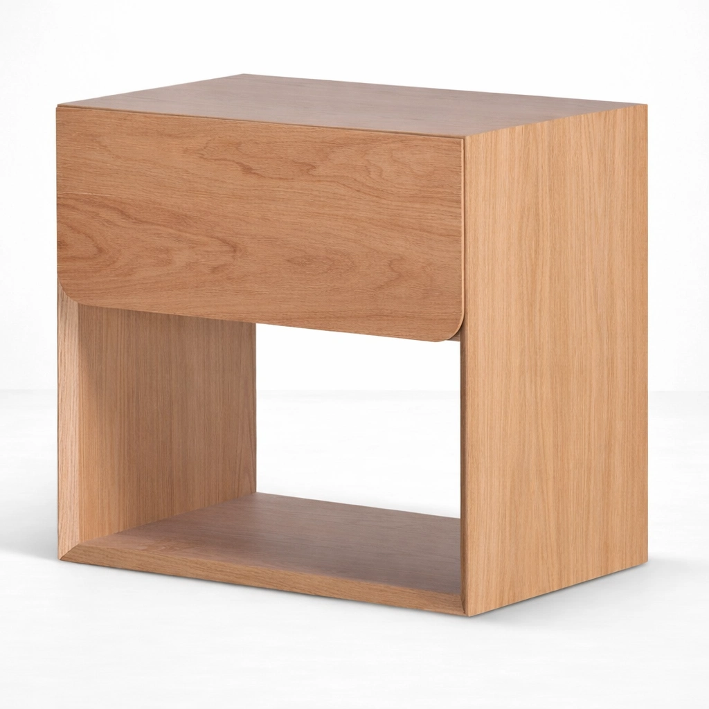 The softly rounded lower corners of the drawer front add a subtle design detail that makes the piece feel gentle and refined without losing its modern character. The open-frame structure also makes it a suitable choice for smaller bedrooms, as it keeps the overall look visually light.