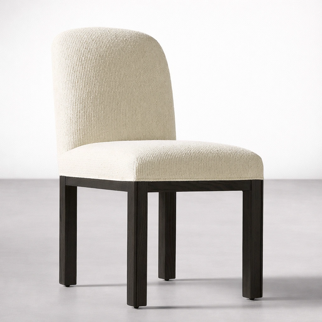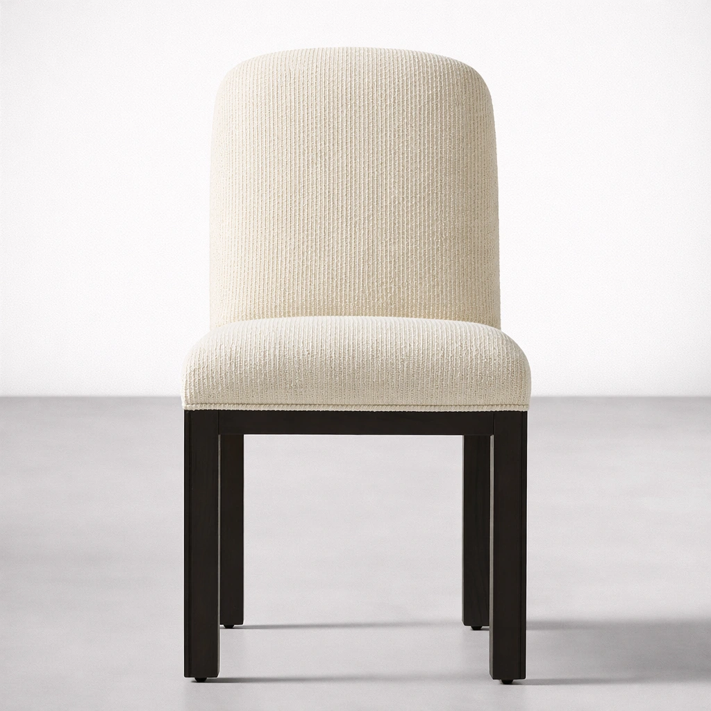 The soft textured cream fabric adds warmth and sophistication, making this chair suitable for modern dining rooms, apartments, hospitality spaces, and designer interiors. Its clean silhouette allows it to blend effortlessly with a variety of dining tables and décor styles.