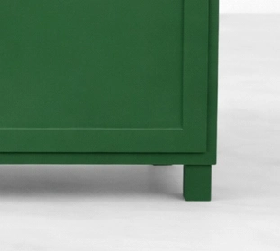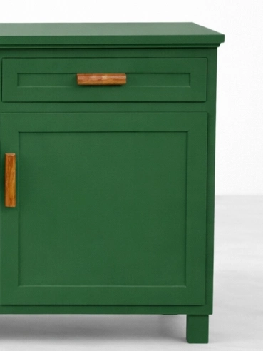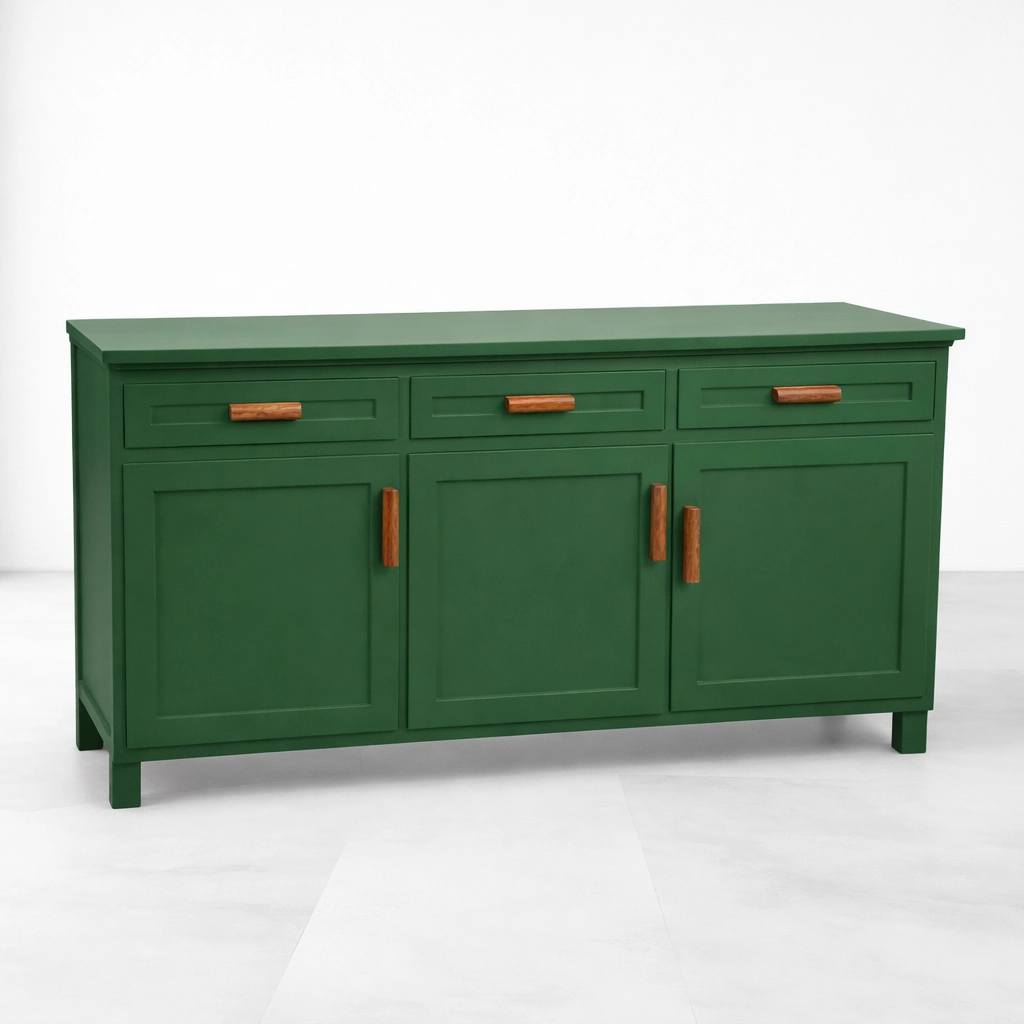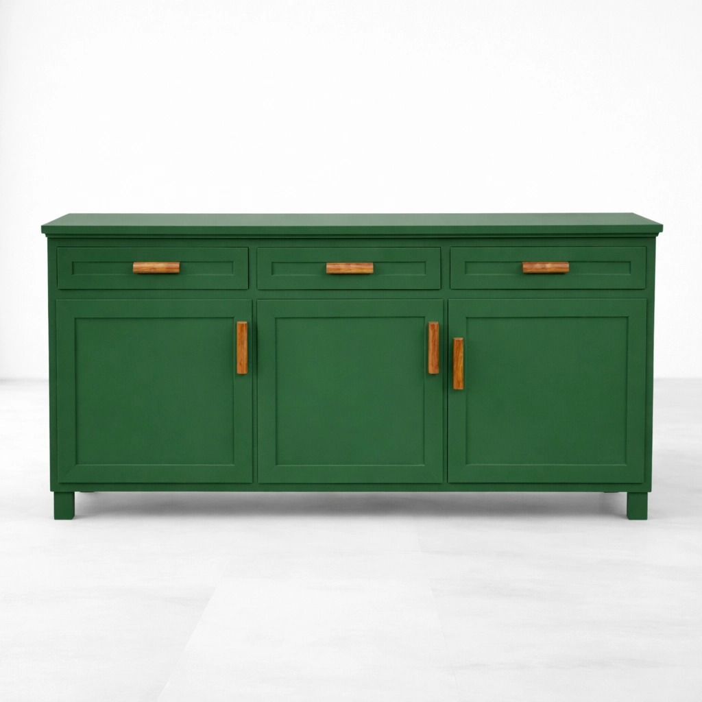 Its teak wood construction gives the piece a strong and lasting character, while the emerald green finish adds a fresh and distinctive presence. The design feels simple and composed, yet the balanced front layout gives it a clear identity. The framed drawer fronts and paneled cabinet doors keep the piece visually neat, while the warm wood-toned handles soften the painted body and add a welcoming touch.