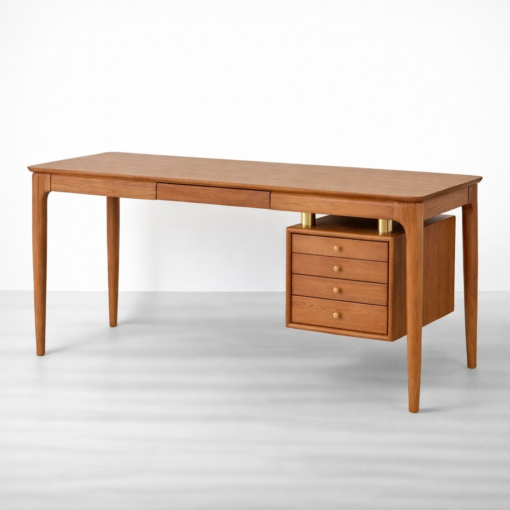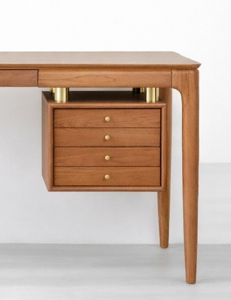 Its form feels balanced, minimal, and elegant while still offering useful everyday storage. The center drawer is suitable for smaller essentials such as stationery, papers, or chargers, while the side drawer unit helps organize documents, writing tools, and work accessories in a neat and accessible way. The brass knobs and connector accents add a subtle highlight without disturbing the clean wooden character of the design.