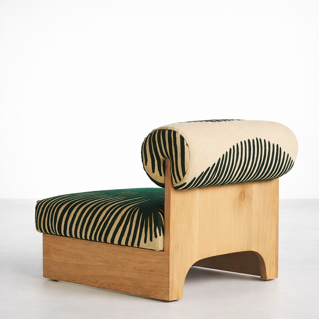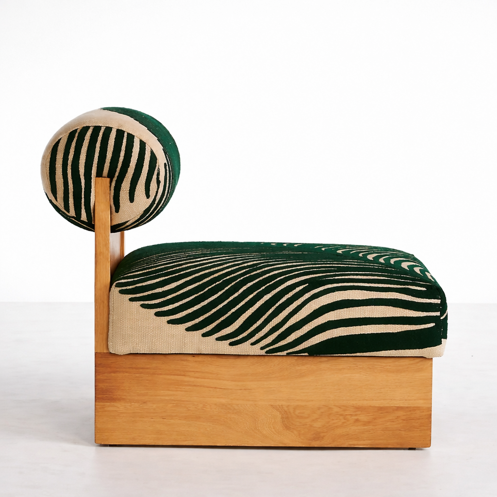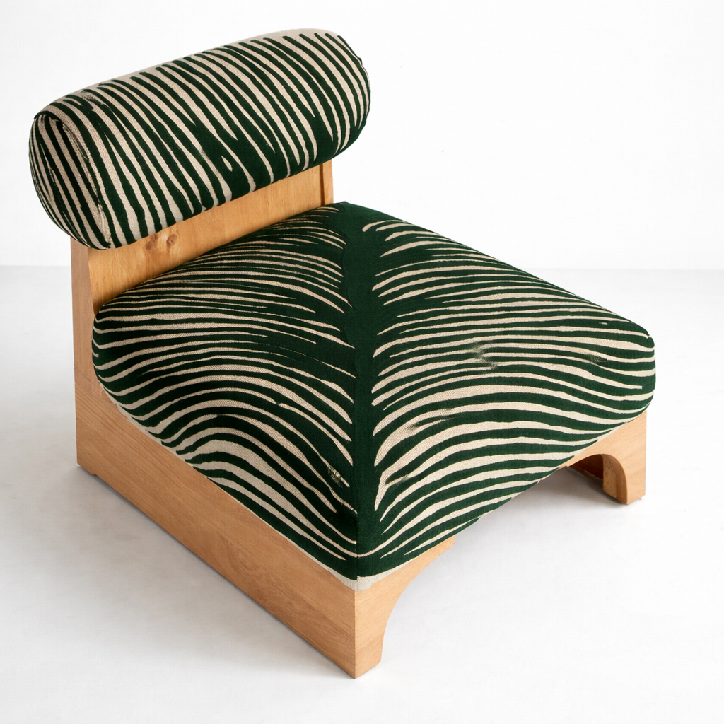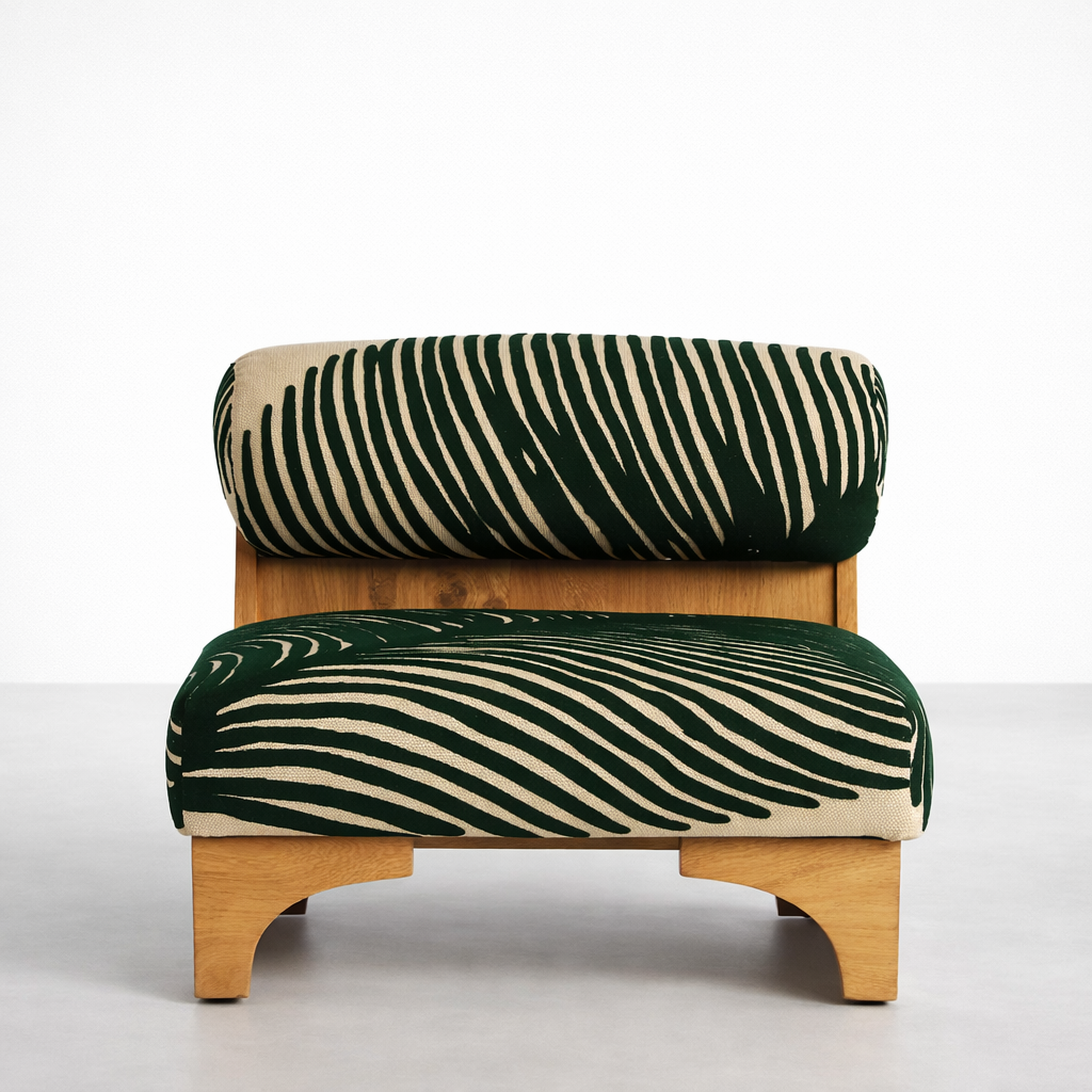 The base and back support are crafted from solid teakwood, finished in a natural polish that highlights the grain. The simple box base with soft arches at the front balances the playful upholstery, giving the green zebra print teakwood lounge chair a refined, gallery like presence.