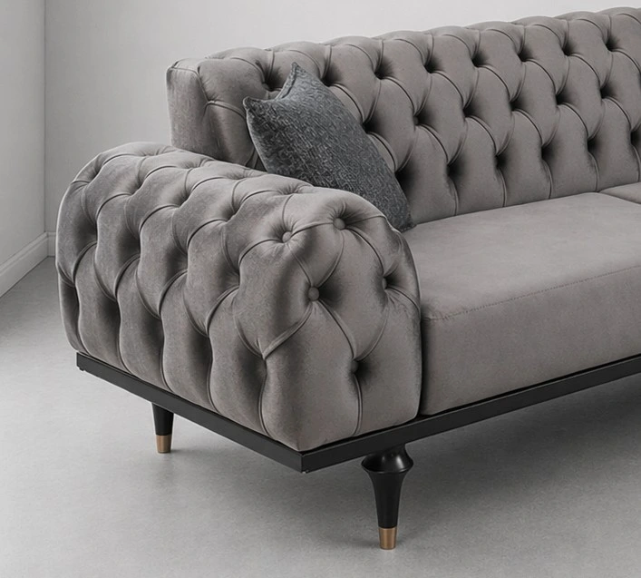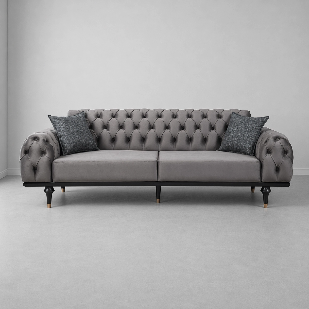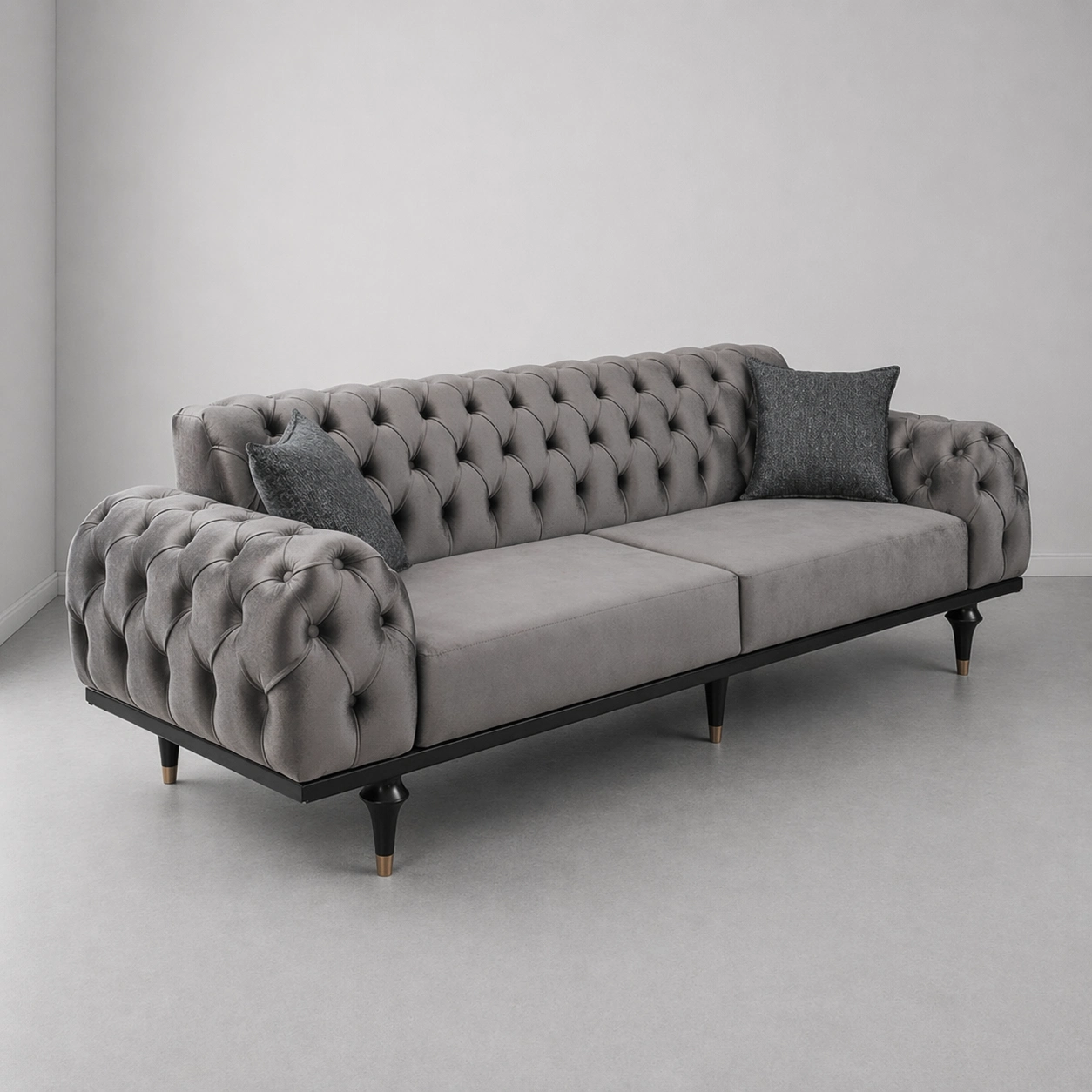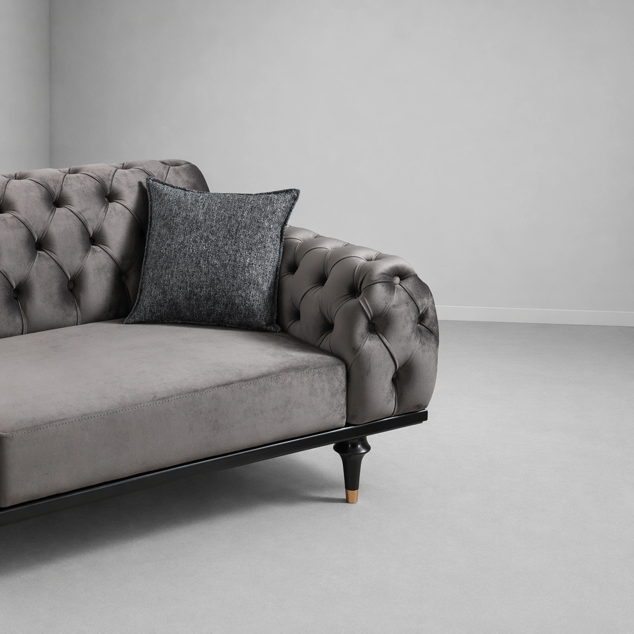 This sofa features a fully tufted backrest, tufted side arms, wide cushioned seating, black wooden base, designer legs with gold tips, and premium throw cushions. The grey velvet-look fabric gives a soft, elegant, and luxurious feel, while the detailed button tufting adds a royal designer touch grey velvet sofa.