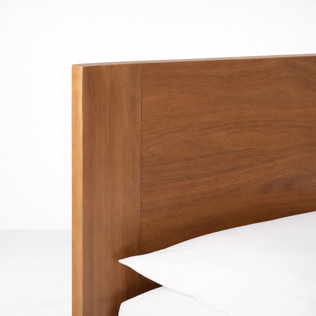 • Curved panel headboard detail of a solid teakwood bed with visible wood grain finish
