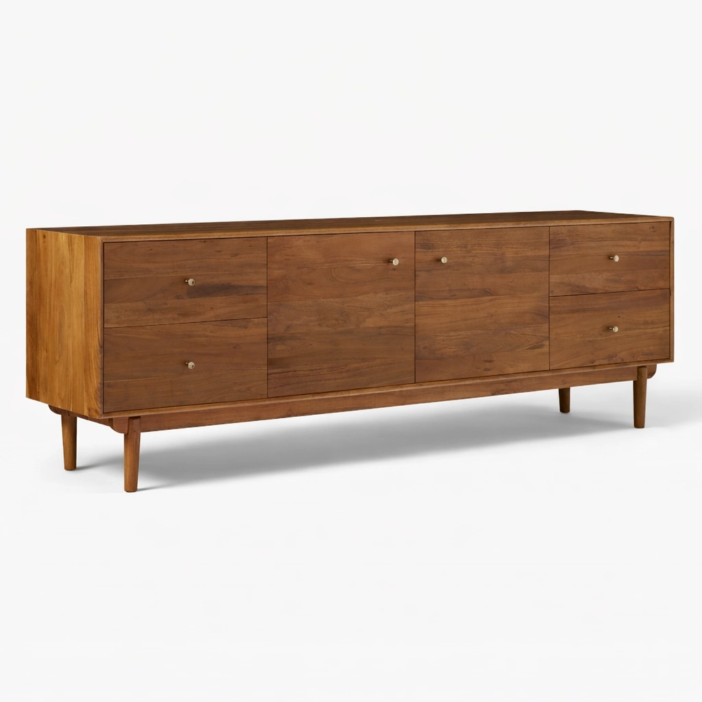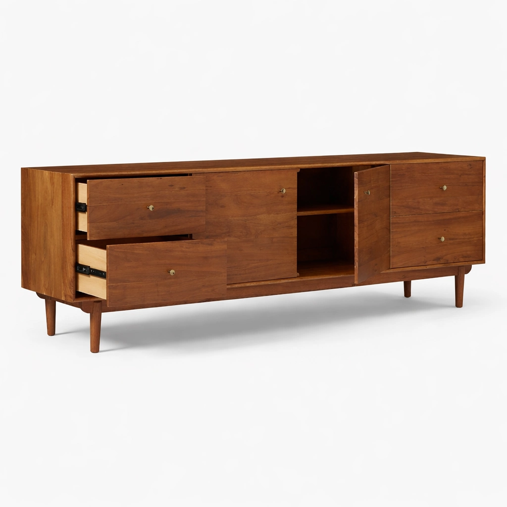 The Horizon Panel Teak Wood Media Console works beautifully in living rooms, lounge areas, media spaces, studio apartments, and hospitality interiors. It offers useful storage for electronics, accessories, books, tableware, chargers, documents, and other daily essentials. The drawers can be used for smaller items, while the central cabinet provides concealed storage with shelf space for larger objects. This makes the unit suitable both as a TV console and as a versatile storage console for modern homes.