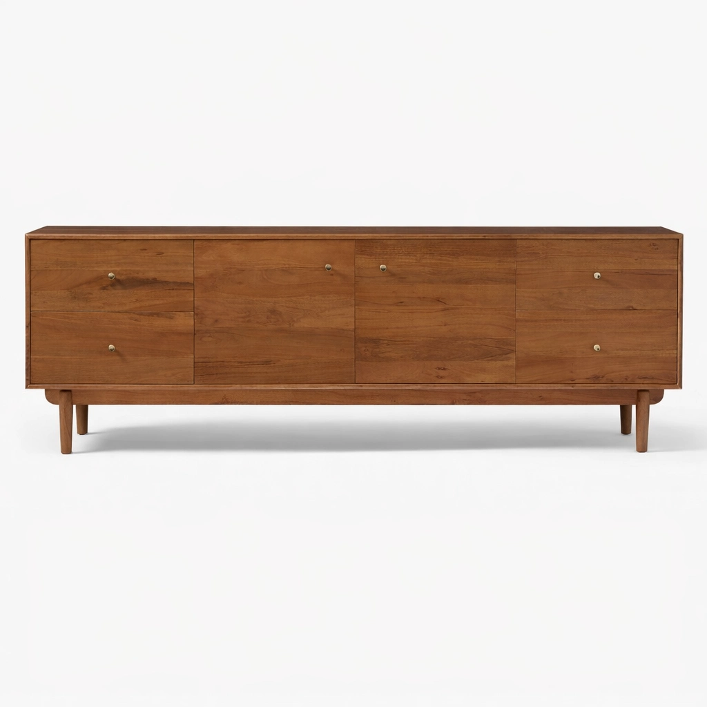 The form of the Horizon Panel Teak Wood Media Console is simple, but its proportions give it a calm and memorable identity. It can function as a media console, TV unit, storage cabinet, or sideboard while still maintaining a refined look. The clean front, generous top surface, and organized storage arrangement make it practical for everyday use, while the teak wood body adds warmth and lasting appeal.