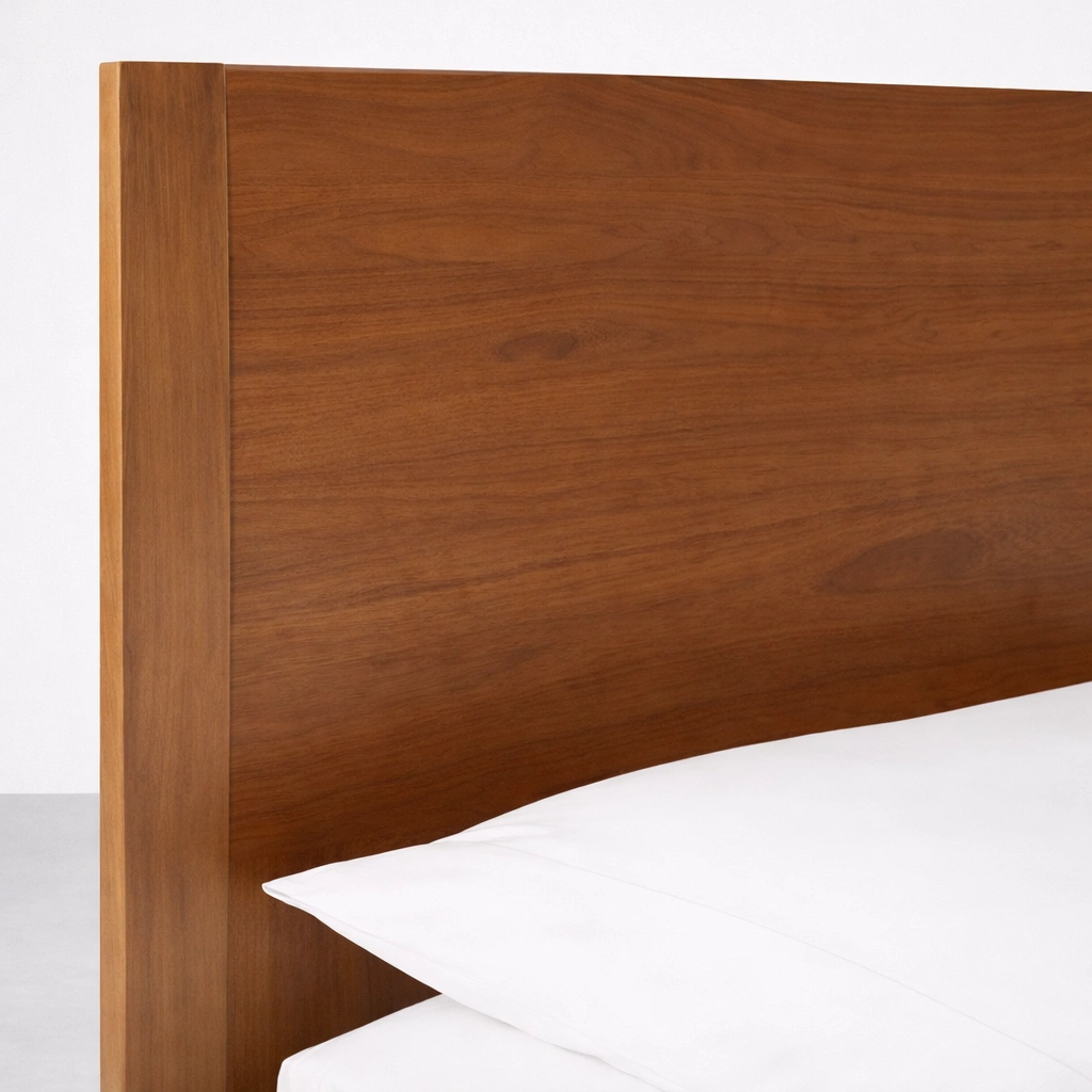 The headboard has a broad panel profile with a subtle curve that softens the look without adding bulk. It supports comfortable sitting for reading and gives the bed a neat, finished presence against the wall.