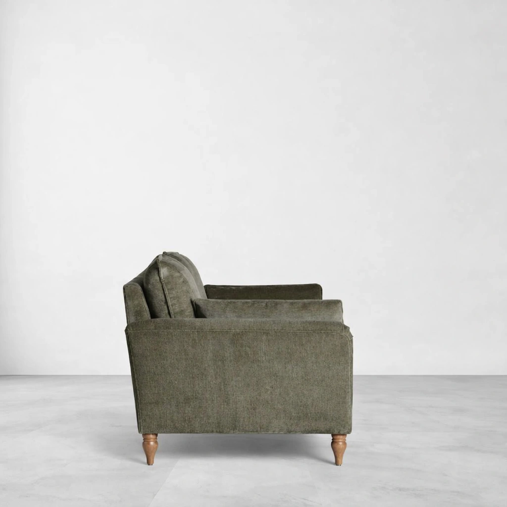 The INTERIORZE Arden olive green 2 seater sofa is made for homes that value comfort and a quiet, balanced look. The rounded arms, soft cushions, and compact footprint make it easy to place in living rooms, studios, and reading corners. The olive green upholstery brings depth without feeling loud, and the teakwood legs add natural warmth.