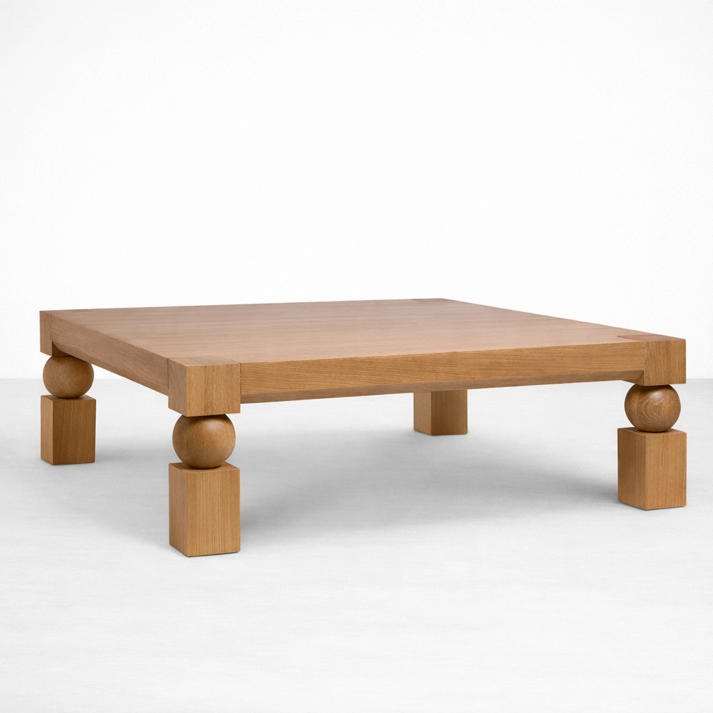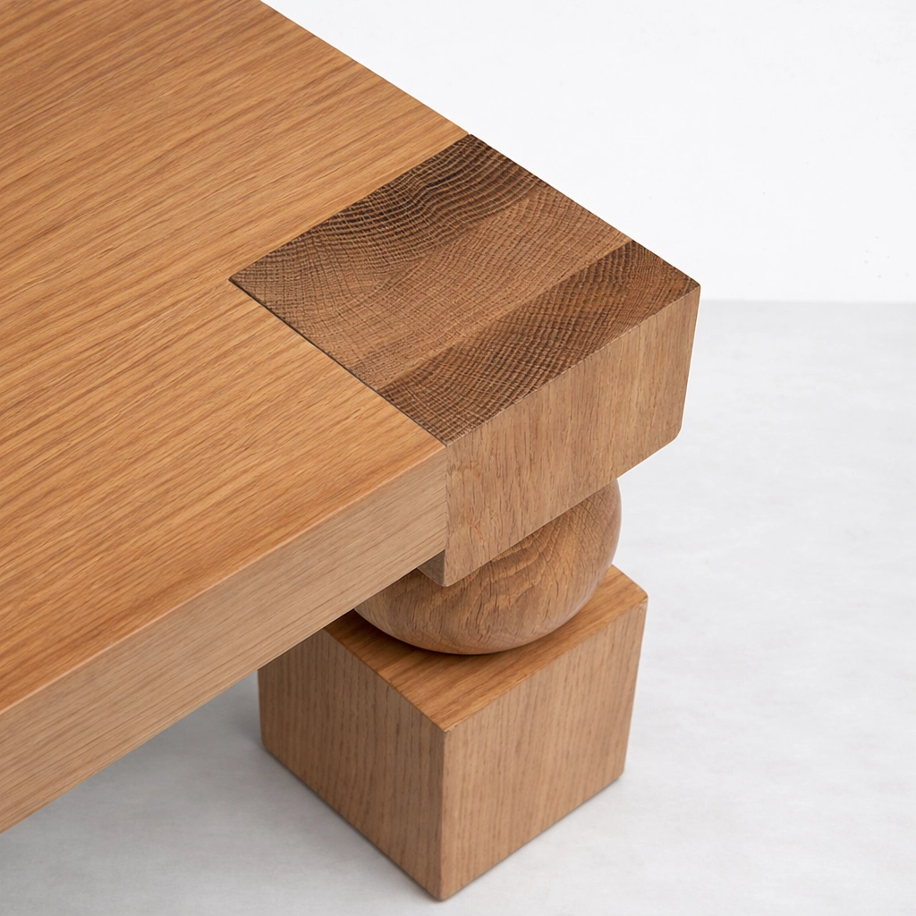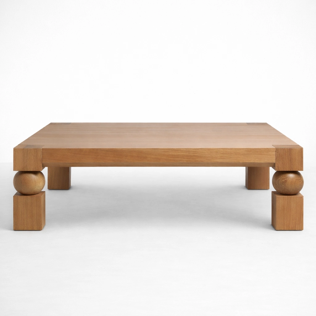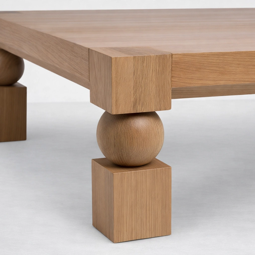 The design features a clean rectangular top supported by sculptural ball and block legs, giving it a distinct and refined character.