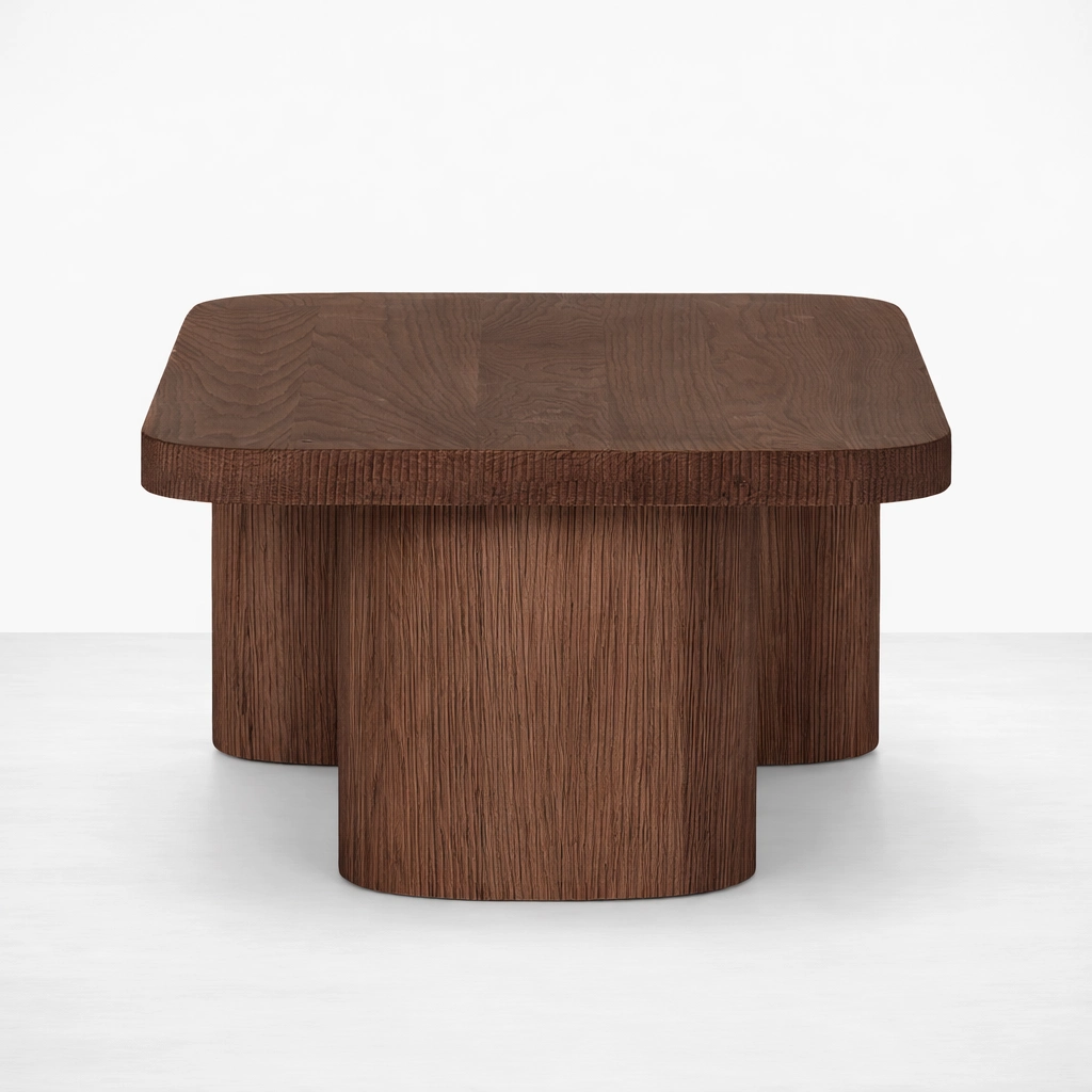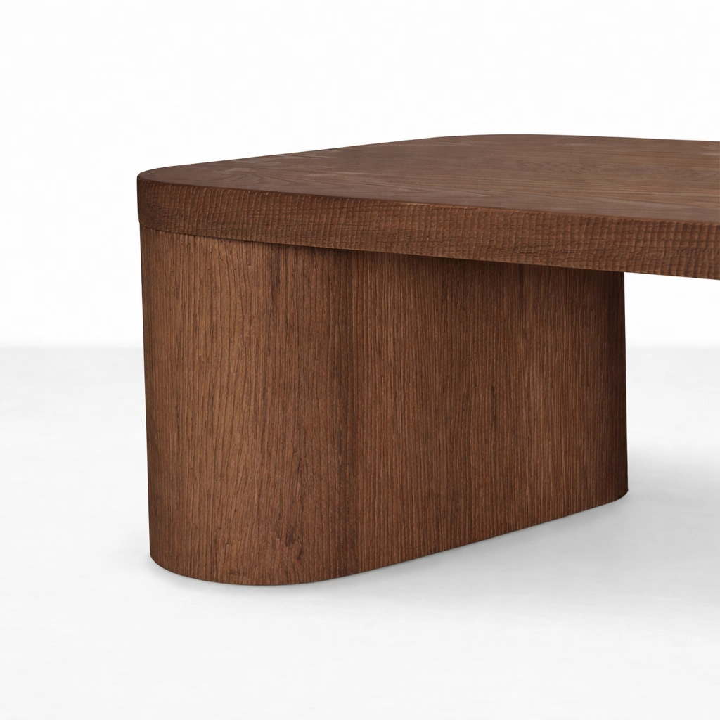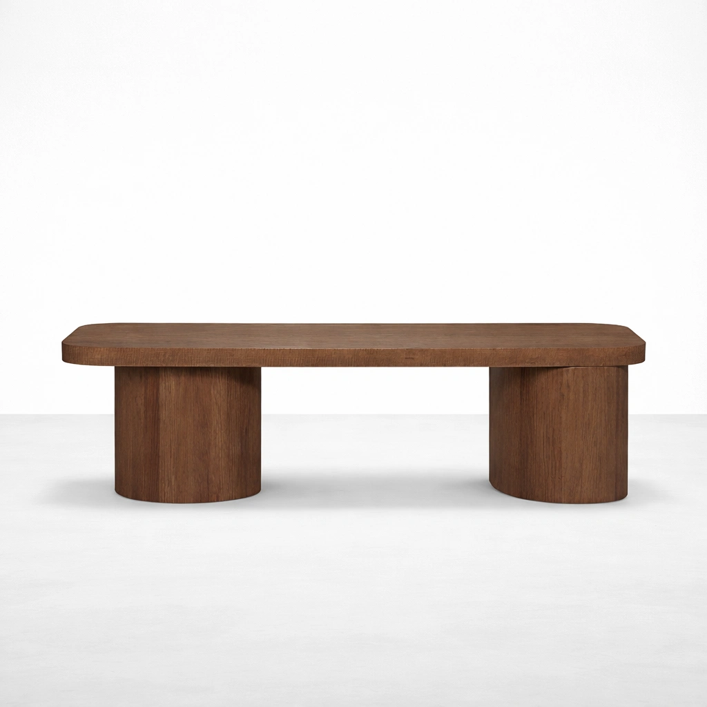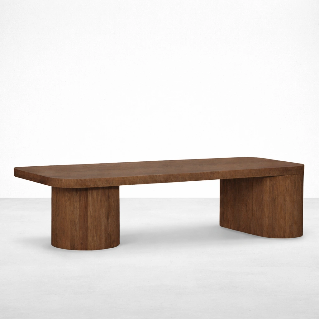 The INTERIORZE Atlas Teakwood Center Table is designed for interiors that appreciate simple geometry, natural wood texture, and a calm architectural presence. Crafted in teakwood, this center table features a broad rectangular top with softened corners, supported by bold rounded pillar bases that give the piece a balanced and sculptural character.