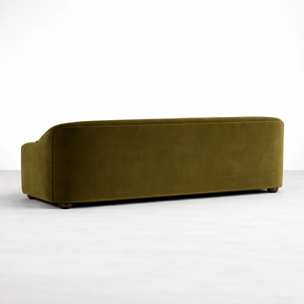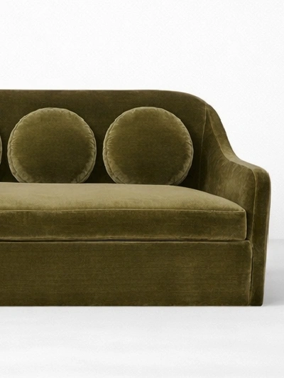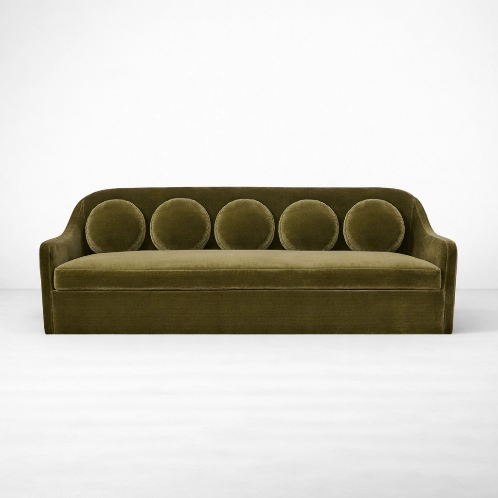 The INTERIORZE Aurelia olive green velvet sofa is designed for homes that want comfort with character. Its smooth curves and rounded arms create a gentle profile, while the row of round cushion backs adds a quiet design highlight. The olive green velvet upholstery brings a warm, luxurious tone that pairs well with modern, vintage, and contemporary interiors olive green velvet sofa.