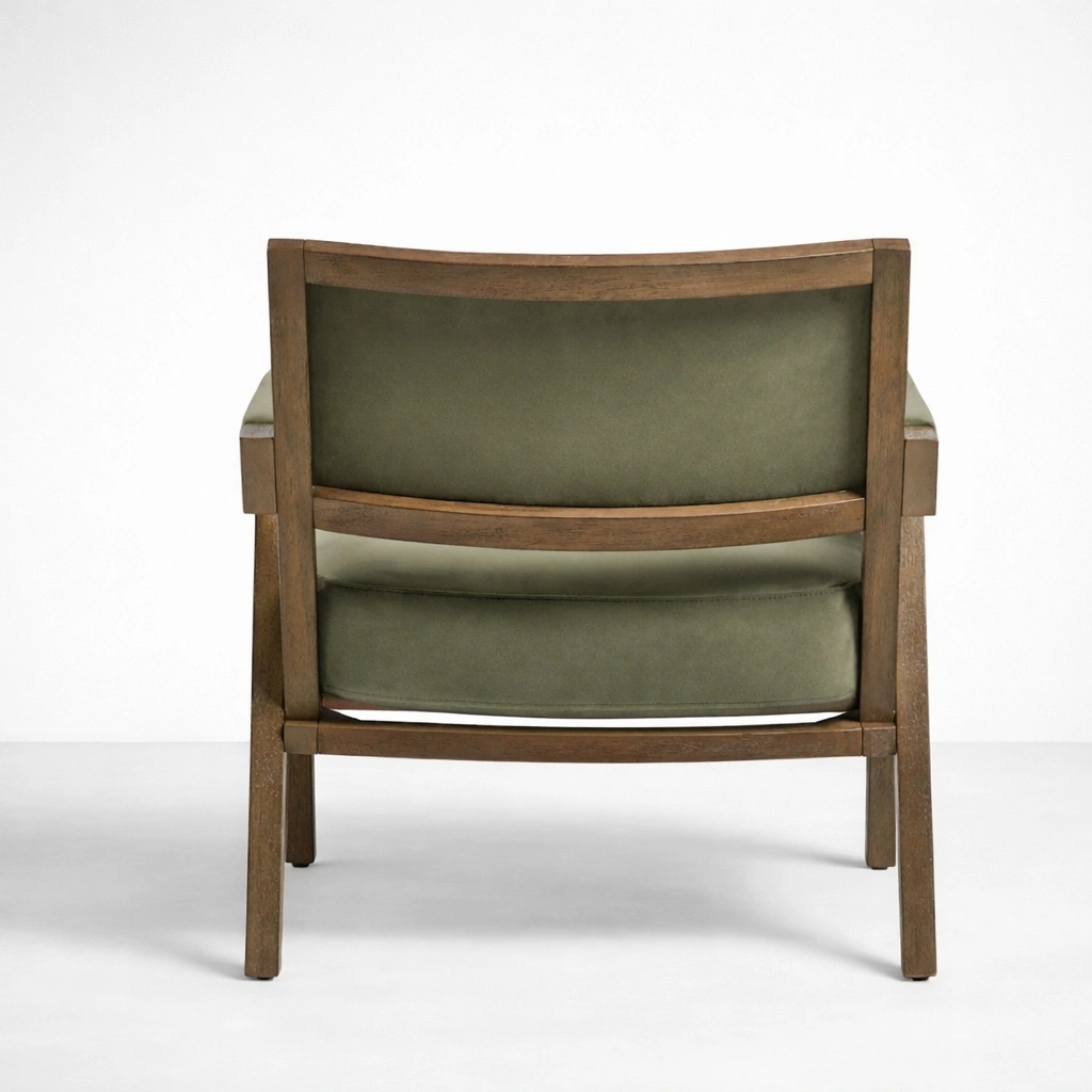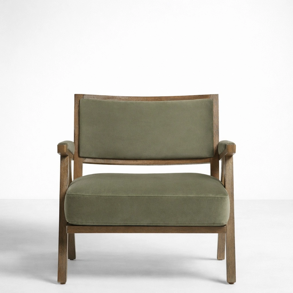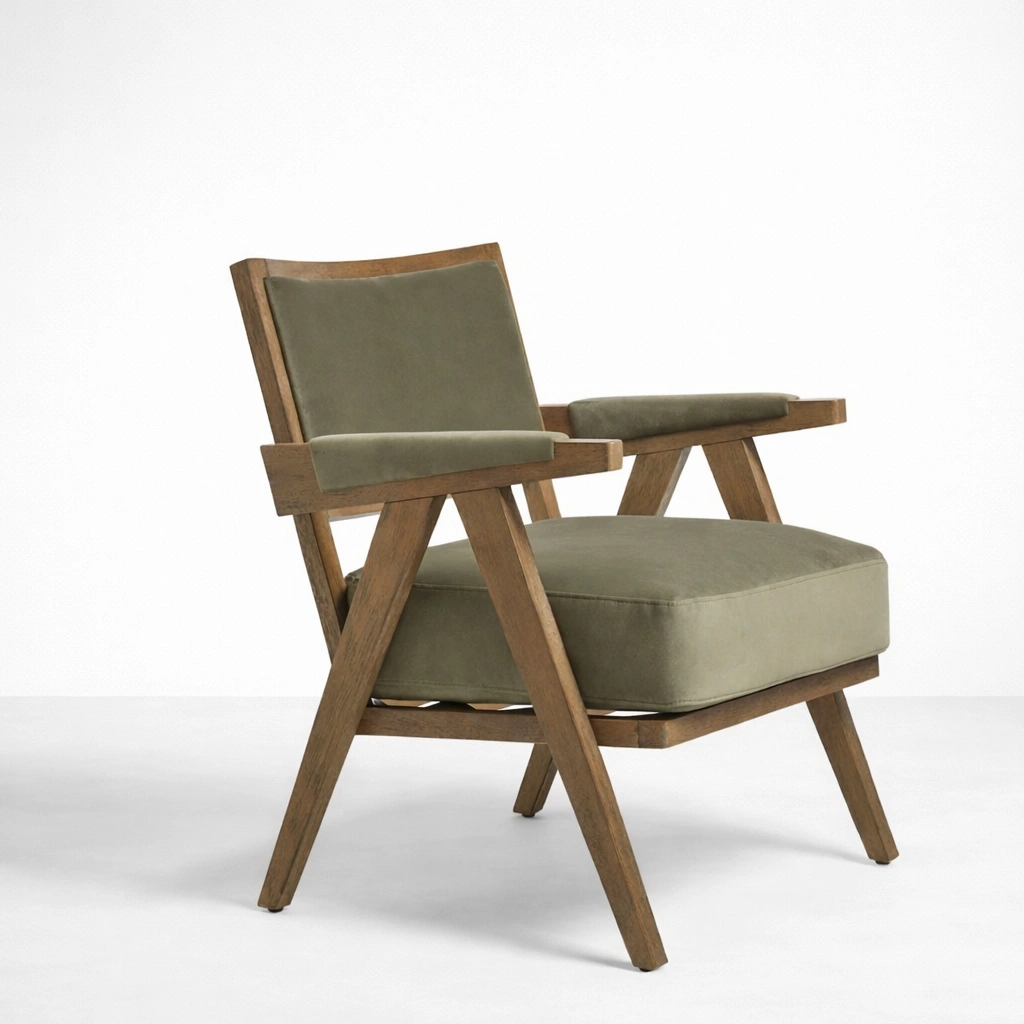 Its generously cushioned seat and backrest are upholstered in a soft olive-toned fabric that adds warmth and understated sophistication. The wide armrests and balanced proportions make it a comfortable choice for everyday seating, whether placed in a living room, reading corner, bedroom, studio, or lounge area.