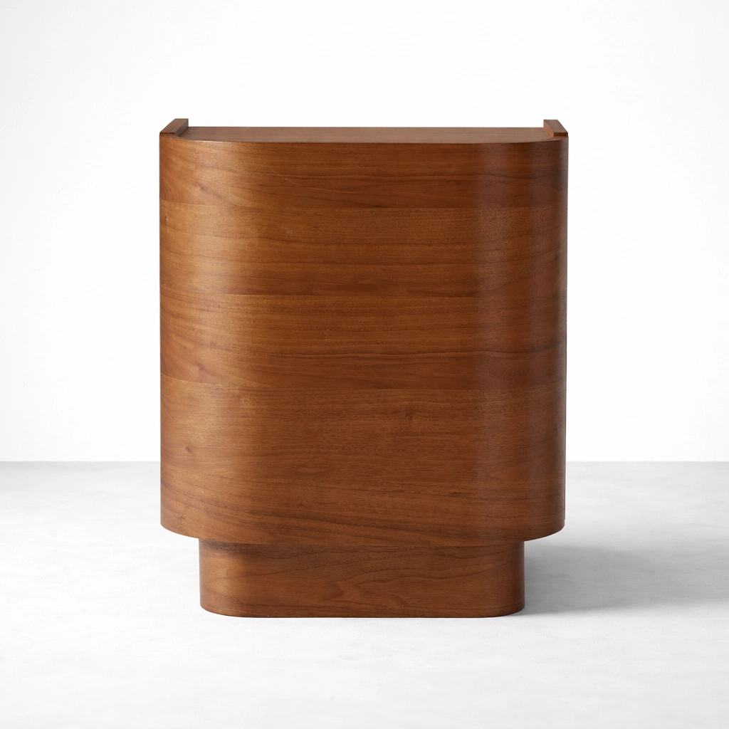 The INTERIORZE Curved Teakwood Accent Bedside is created for interiors that appreciate soft shapes, useful storage, and timeless wooden craftsmanship. Defined by its gently rounded front profile, clean side panels, and warm teakwood finish, this cabinet brings a calm and sculptural character to the room while serving an everyday purpose.