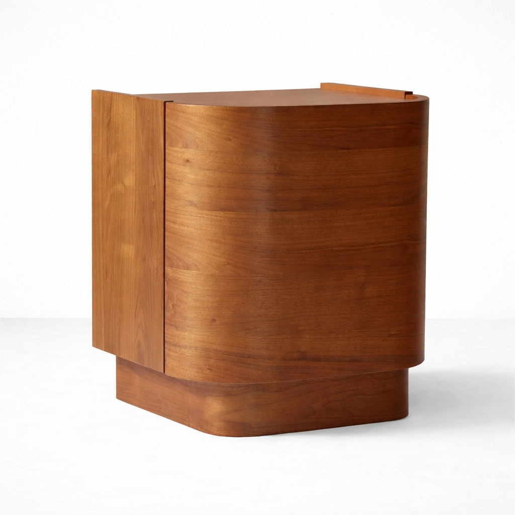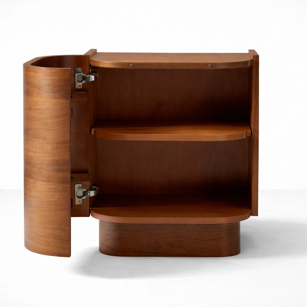 Behind its curved door, the bedside opens to reveal practical shelf storage that can be used for tableware, books, décor pieces, daily essentials, or neatly arranged household items. Its balanced shape makes it suitable for living rooms, dining spaces, bedrooms, hallways, or study corners where both storage and visual softness are desired.