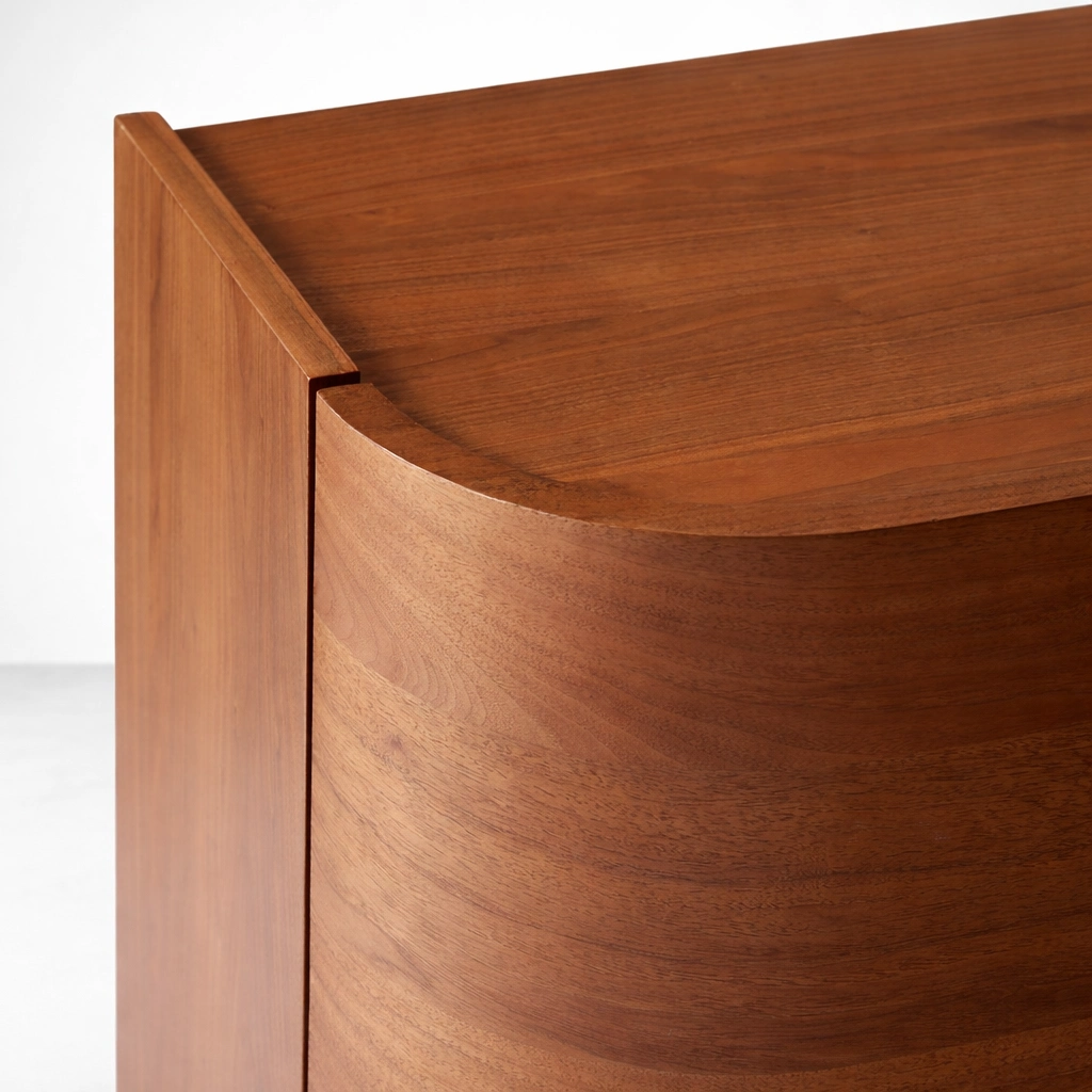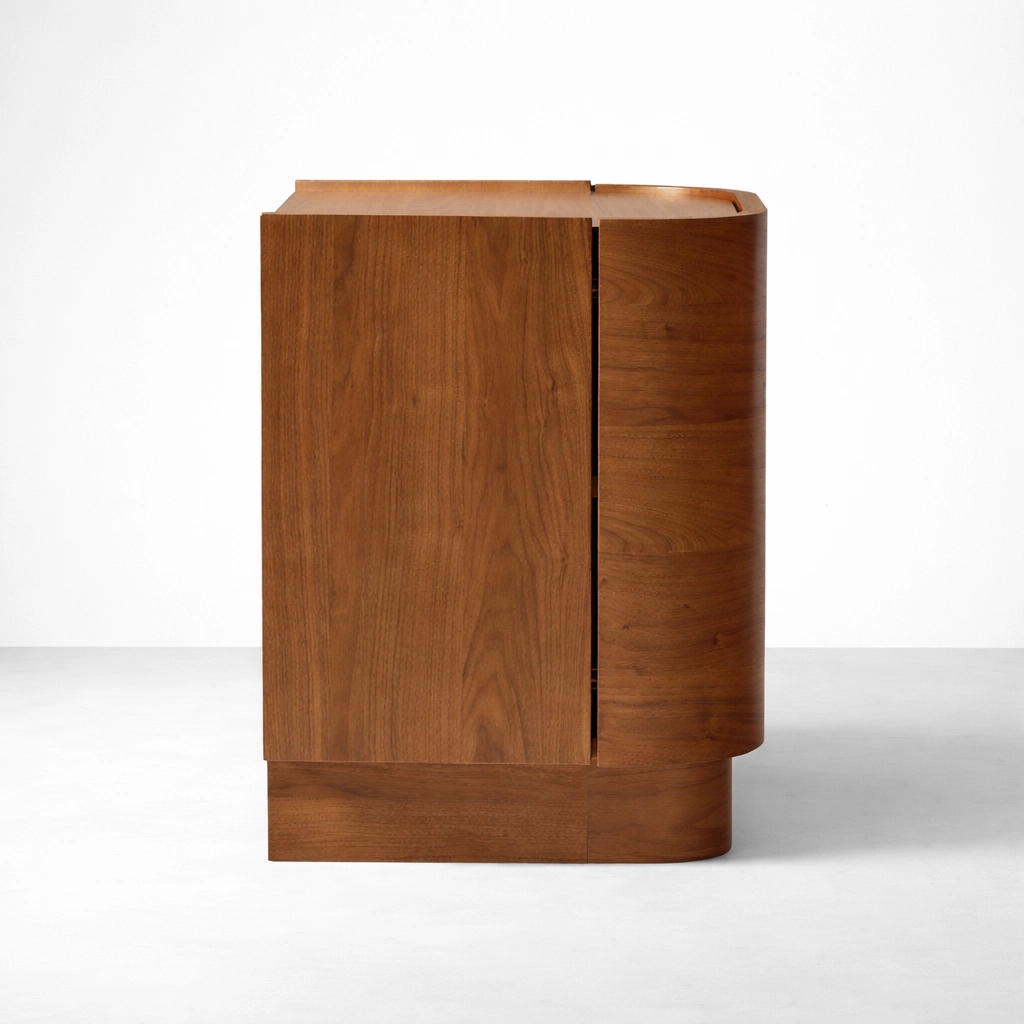 The rich wood tone and rounded detailing help this cabinet work comfortably in modern, contemporary, mid-century, and softly minimal interiors. Rather than appearing bulky, the curved form gives it a lighter and more refined visual presence.