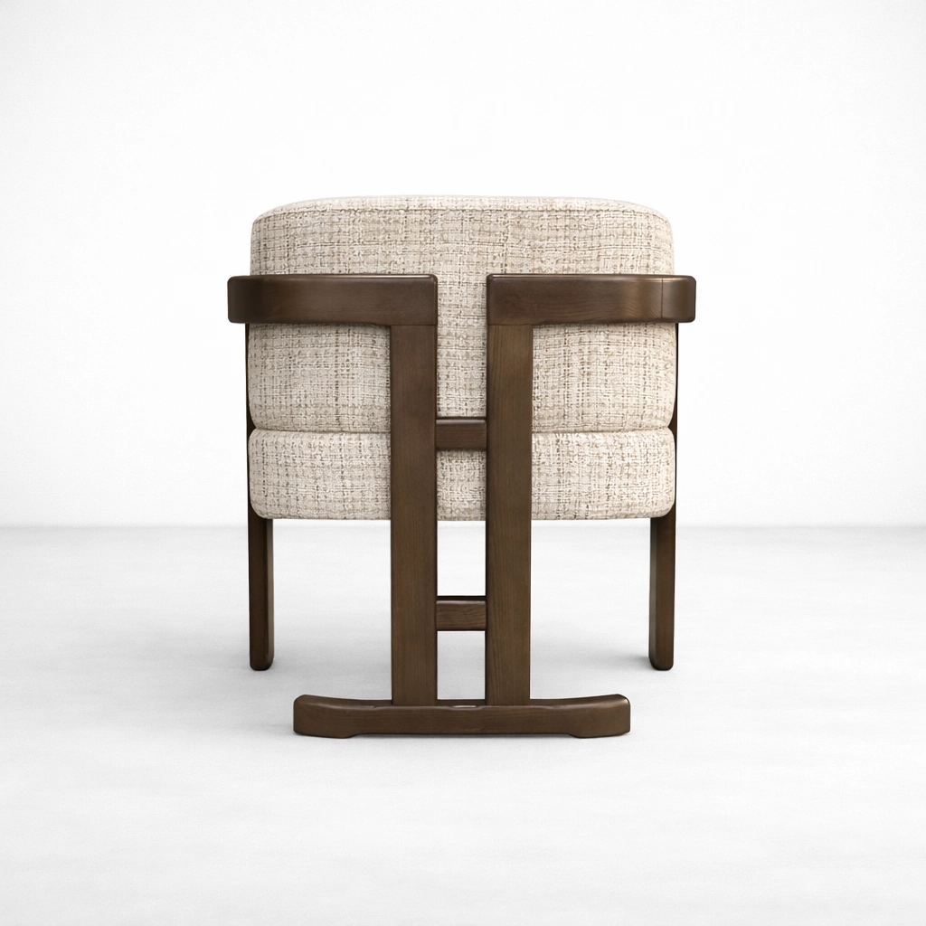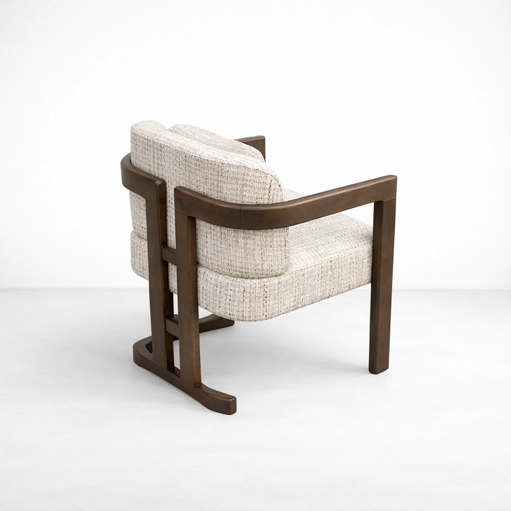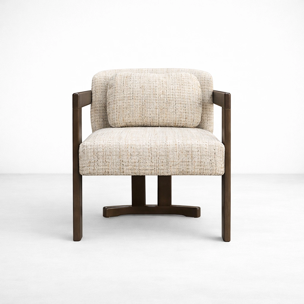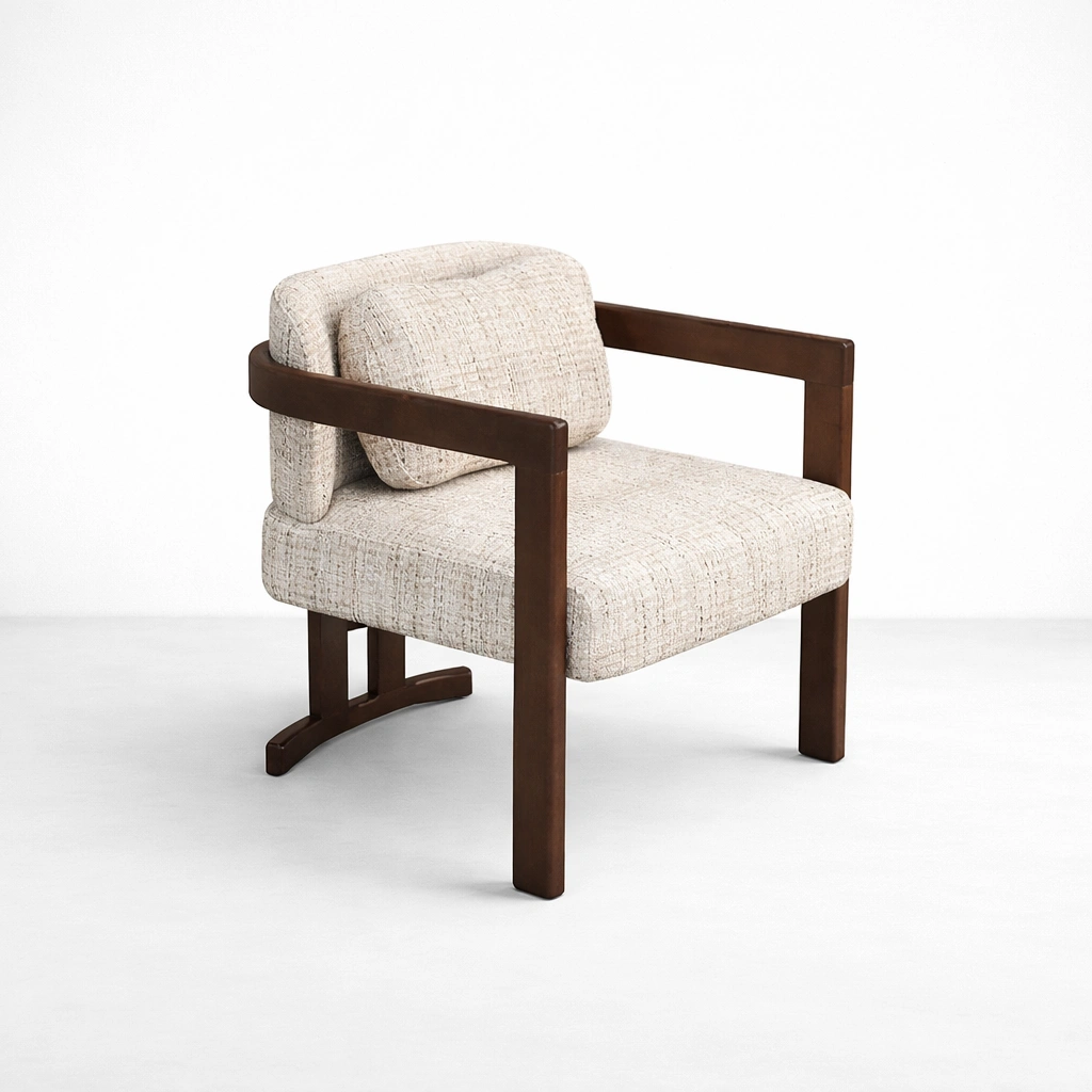 The broad wooden arms and balanced proportions give this chair a composed and elegant presence. Its warm wood finish pairs naturally with the light upholstery, making it easy to place within modern, contemporary, minimal, transitional, and hospitality-inspired interiors.