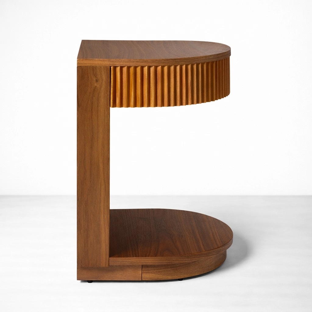 Its upper drawer provides concealed storage for bedside essentials such as chargers, reading glasses, notepads, medicines, remotes, and personal accessories. The open lower shelf keeps daily-use items within easy reach and can also be styled with books, baskets, or decorative accents. The curved edges and fluted detailing add softness and depth to the design, helping the piece feel refined without appearing heavy.