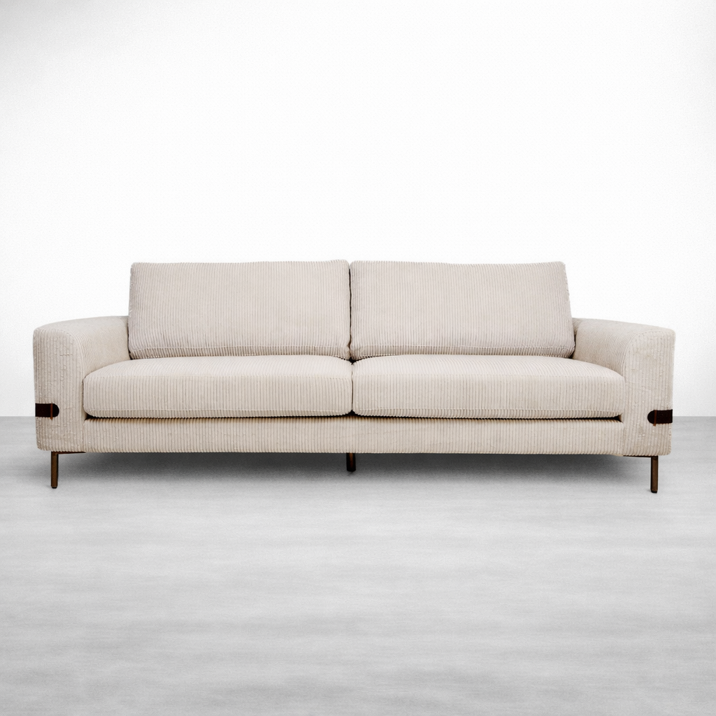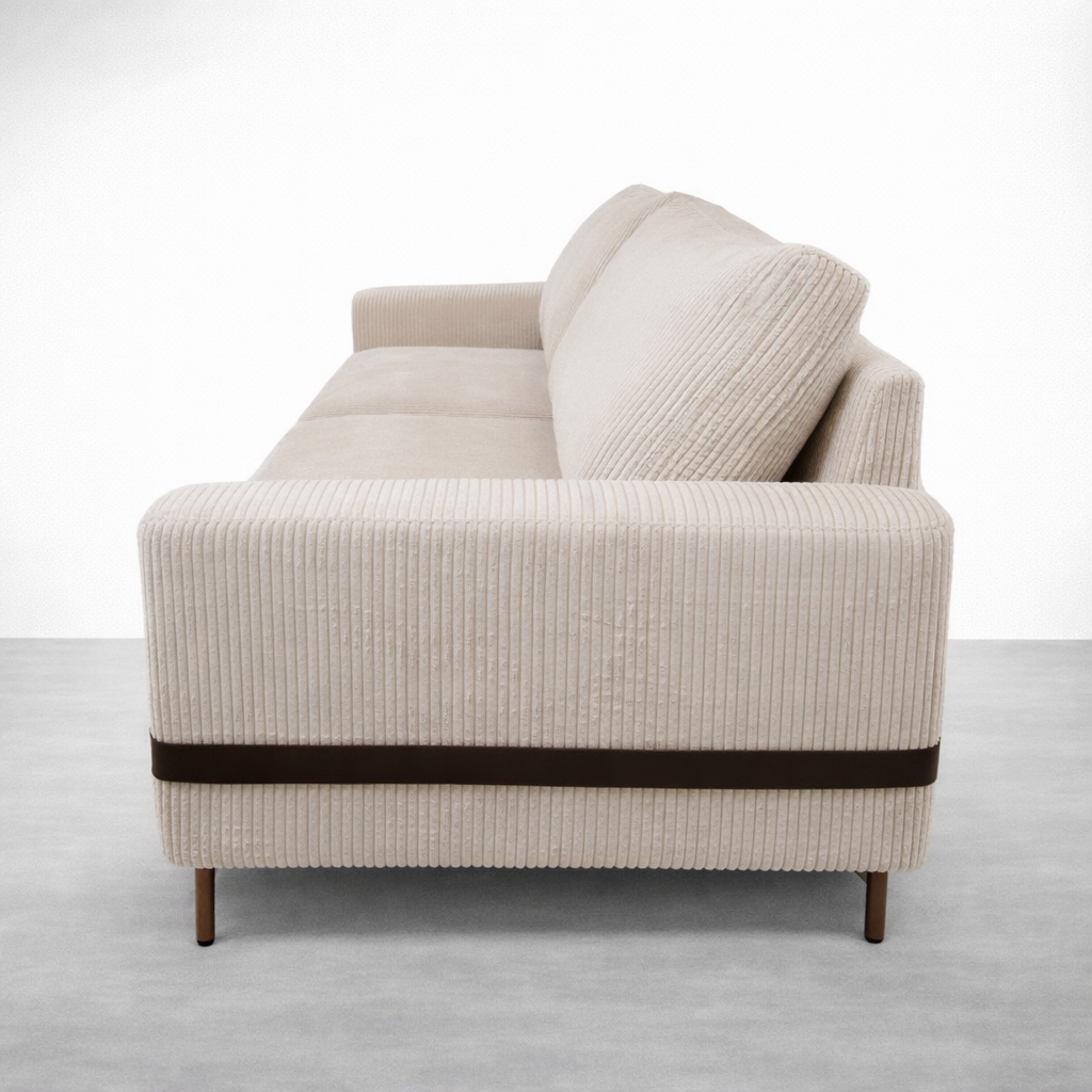 This Corduroy 3 Seater Sofa is designed for homes that prefer a quiet, modern look with a touch of character. The upholstery uses a ribbed corduroy texture in an ivory shade that feels warm and inviting. Slim legs keep the sofa visually light, while the leather strap detail around the arms adds a thoughtful accent without distracting from the clean silhouette. We build each piece on a seasoned hardwood internal frame and focus on comfort for daily living Corduroy 3 Seater Sofa.