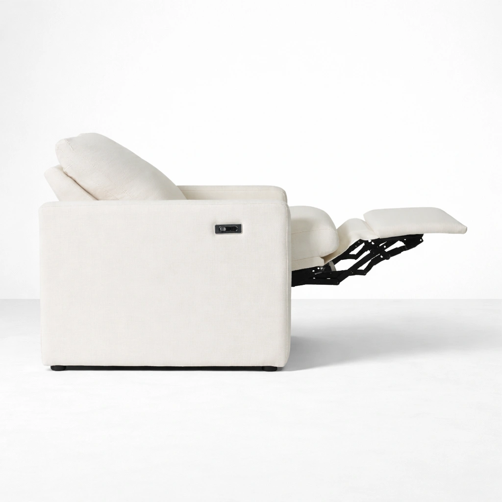 We made this motorized recliner chair for everyday comfort and a calm, minimal look. The soft ivory upholstery pairs well with most interiors, while the supportive back cushion and wide seat help you settle in for reading, resting, or long evenings at home. With the push-button recliner control on the side, you can adjust your lounging angle smoothly and quietly.