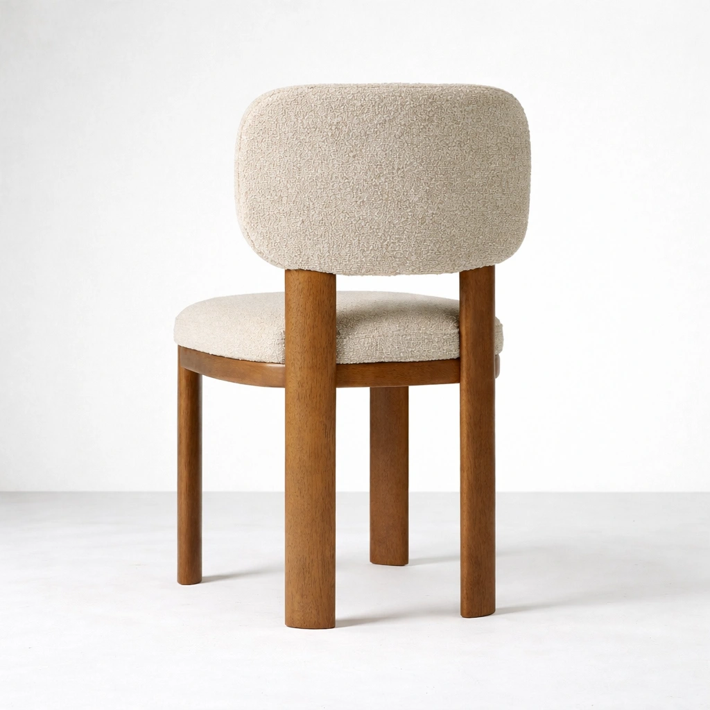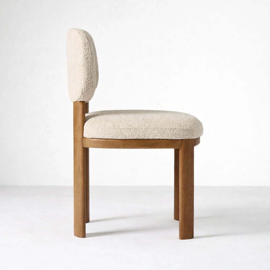 At INTERIORZE, we try to keep furniture simple, durable, and pleasant to live with. The Luna bouclé dining chair is built with a solid teak wood frame and a softly upholstered seat and back, finished in a warm walnut tone. The rounded form and cushioned support make it comfortable for daily dining as well as longer conversations bouclé dining chair.