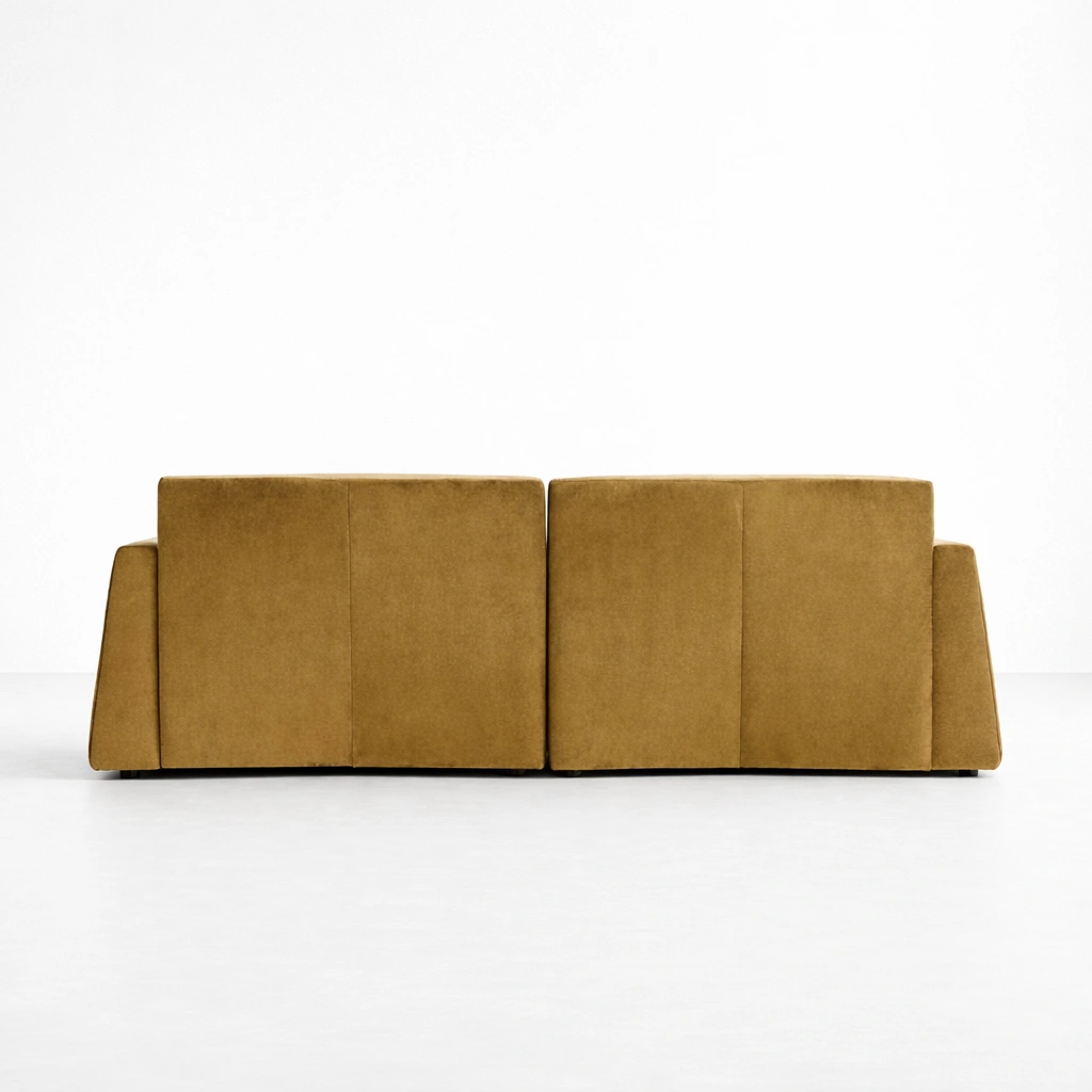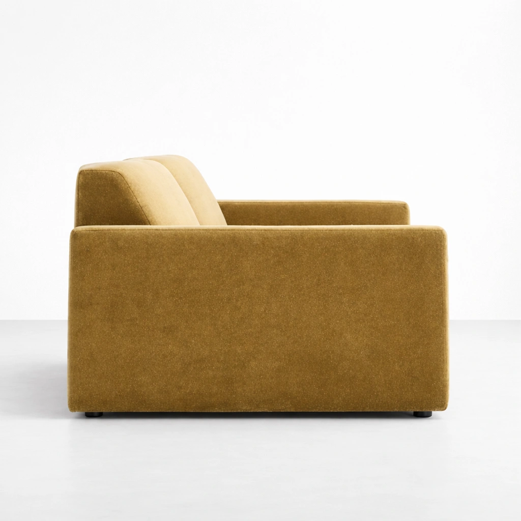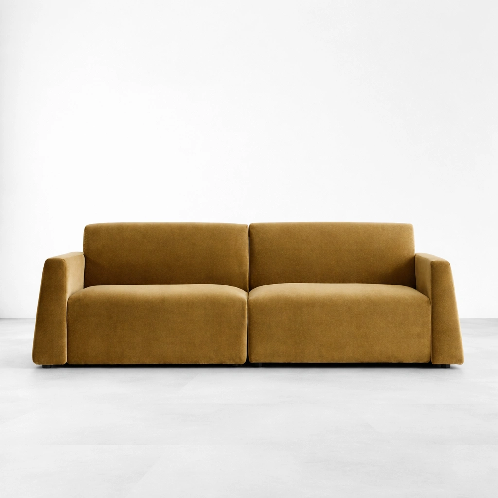 • Angled view of mustard velvet sofa with clean arms by INTERIORZE