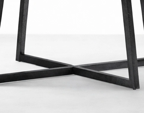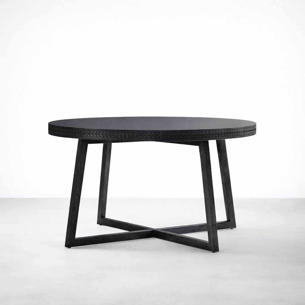 What makes this round dining table distinctive is the subtle textured detailing around the edge, which adds depth and visual interest without overwhelming the clean overall form. The table is supported by a strong geometric base with angled legs and a cross-braced structure, giving it both stability and a contemporary architectural look.