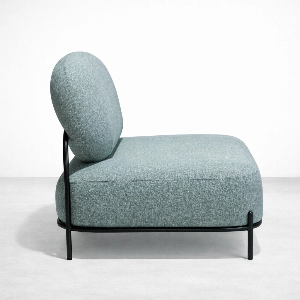 • Seafoam 2 Seater Sofa side view showing upholstered seat and metal frame silhouette