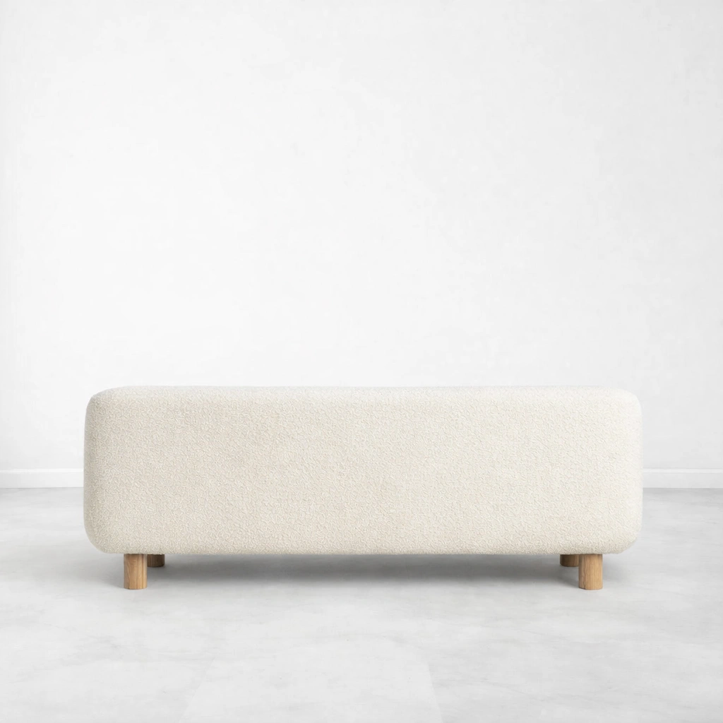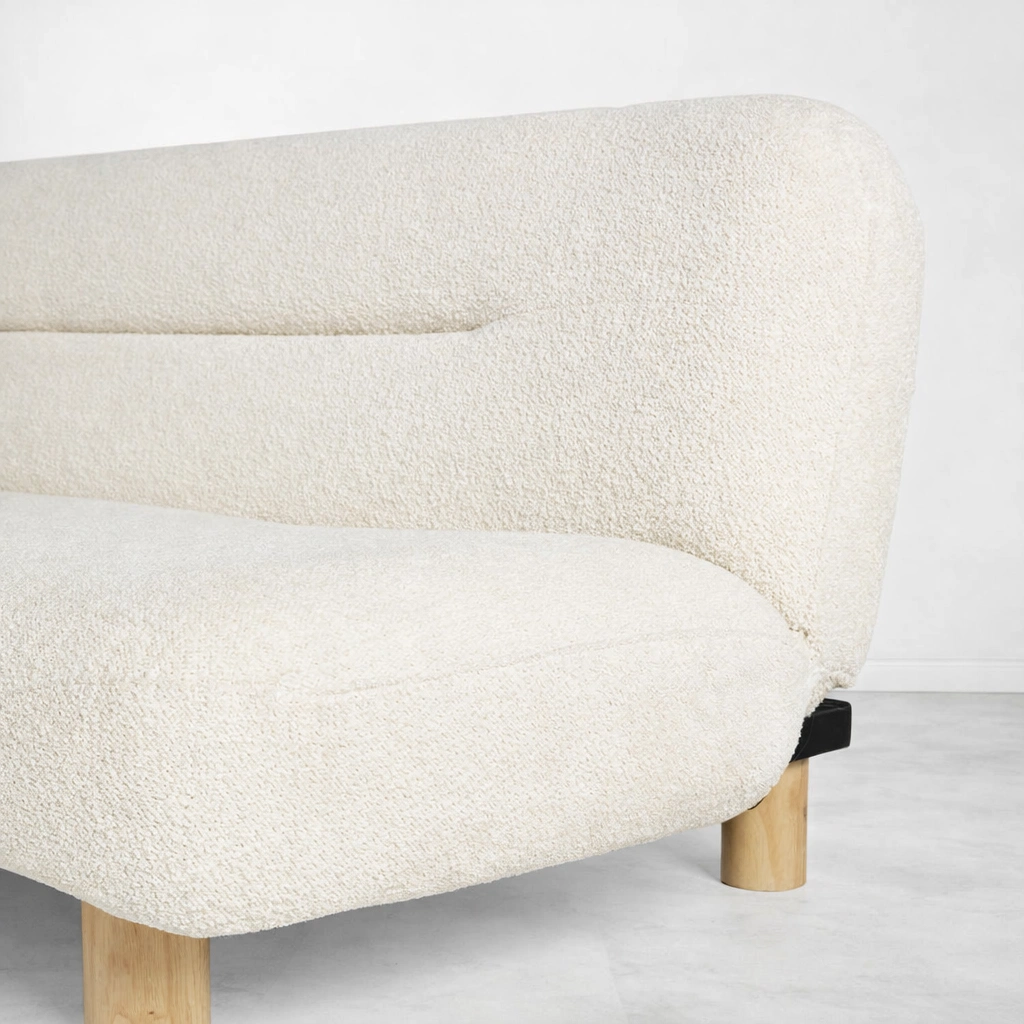 Bouclé upholstery: A textured ivory bouclé fabric selected for its soft touch and cozy visual depth.