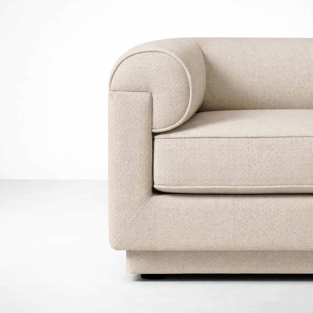 • Close-up of roll-arm design on beige 2 seater sofa by INTERIORZE.