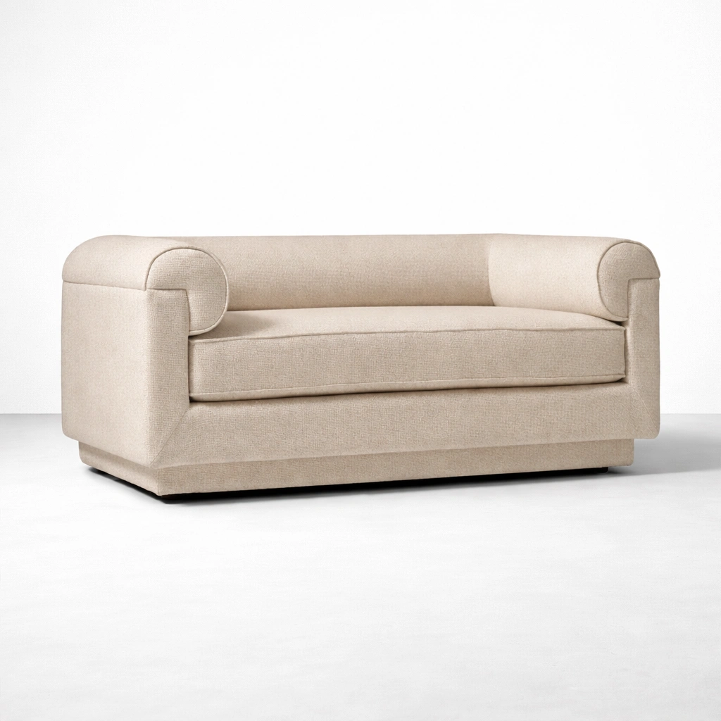 • Angled view of beige 2 seater sofa with roll arms and upholstered base.