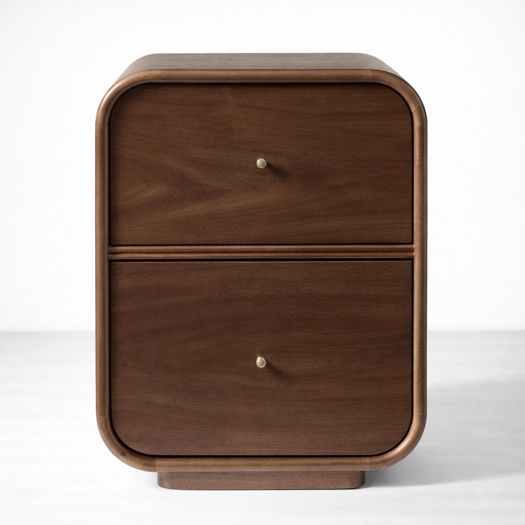 Its two drawers provide convenient closed storage for bedside essentials such as books, chargers, glasses, medicines, notepads, and personal accessories. The compact vertical form makes it useful for both small and medium-sized bedrooms, while the rounded edges help the piece feel softer and more refined in the room.